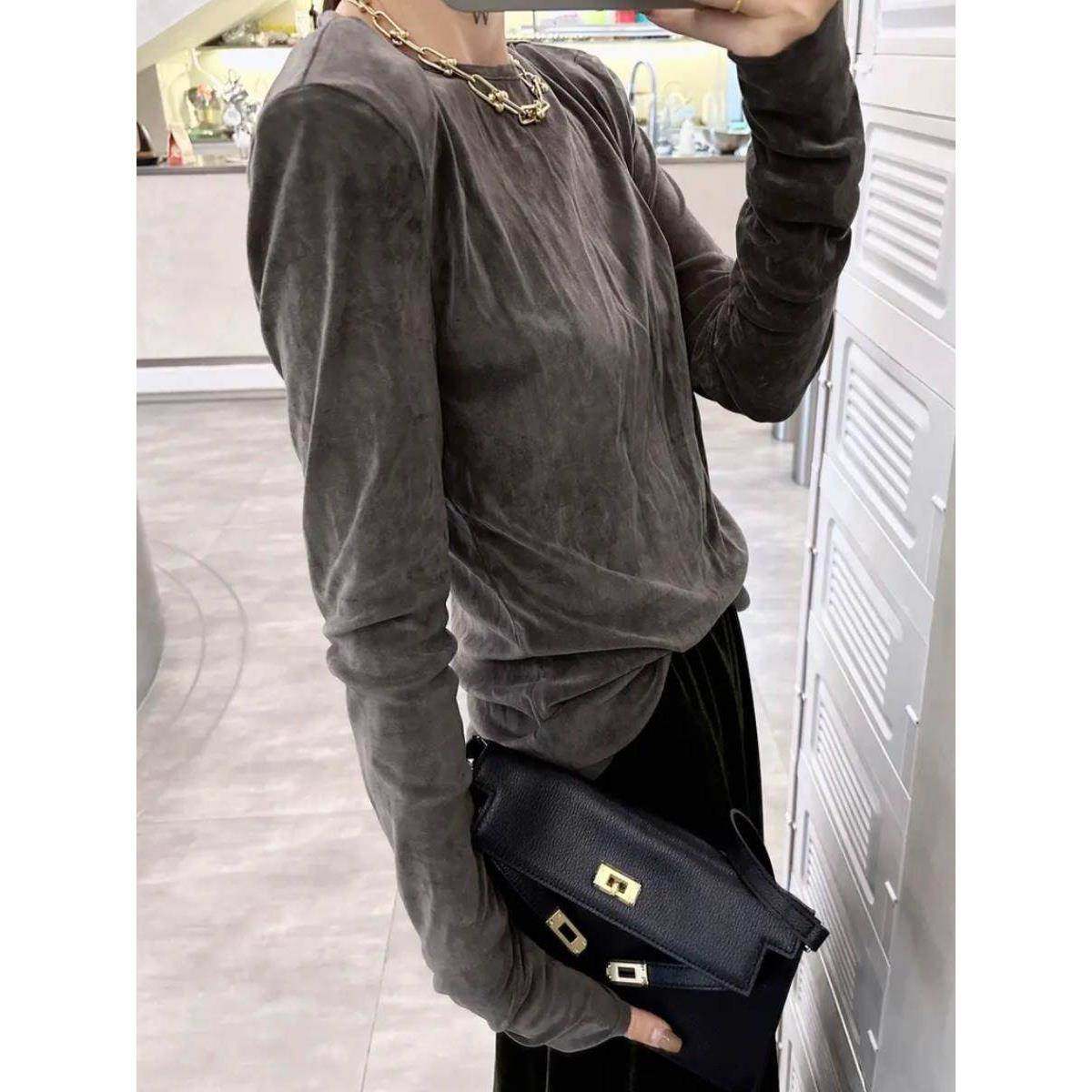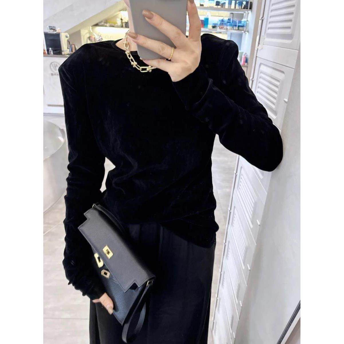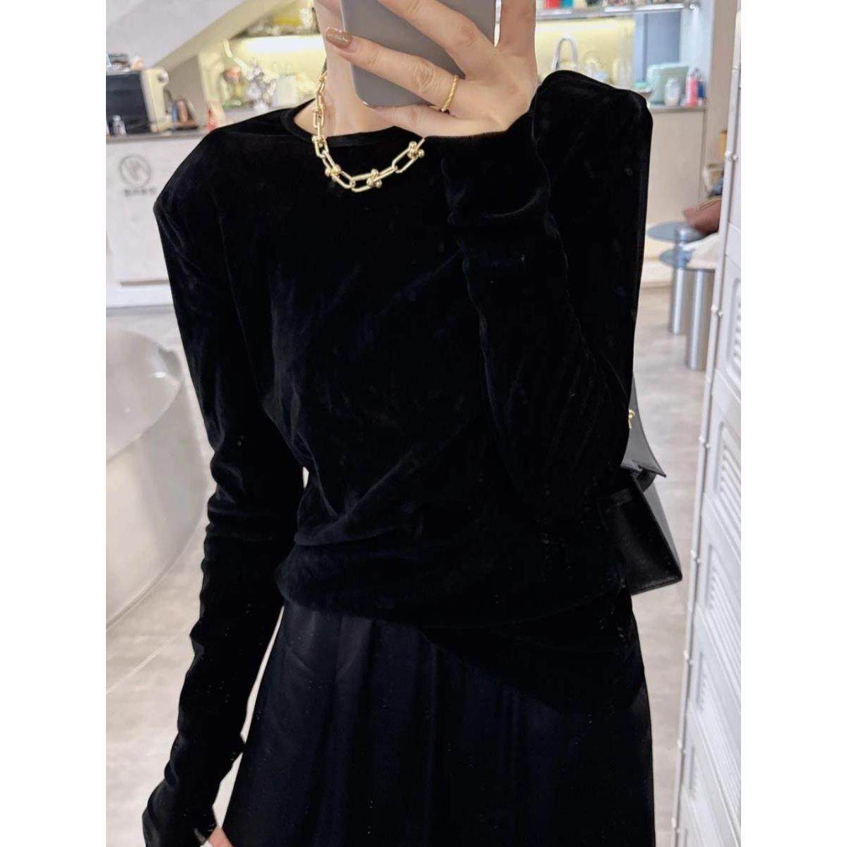 首页> 女装> 欧洲站秋冬新款时尚气质垫肩丝绒长袖T恤女修身百搭打底衫上衣潮