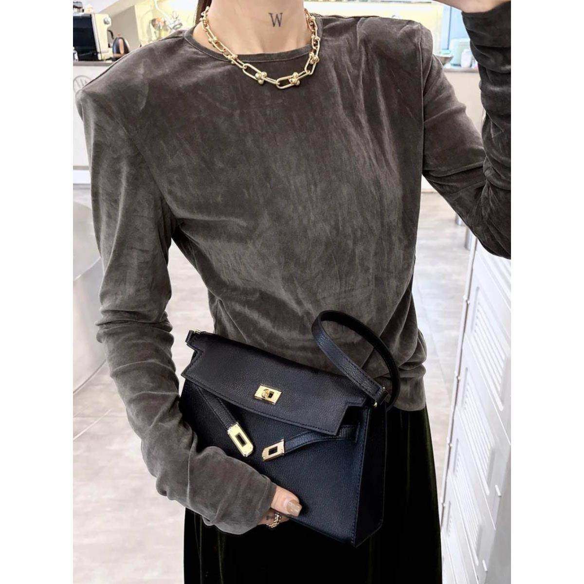 欧洲站秋冬新款时尚气质垫肩丝绒长袖T恤女修身百搭打底衫上衣潮