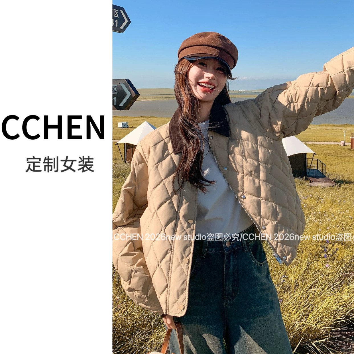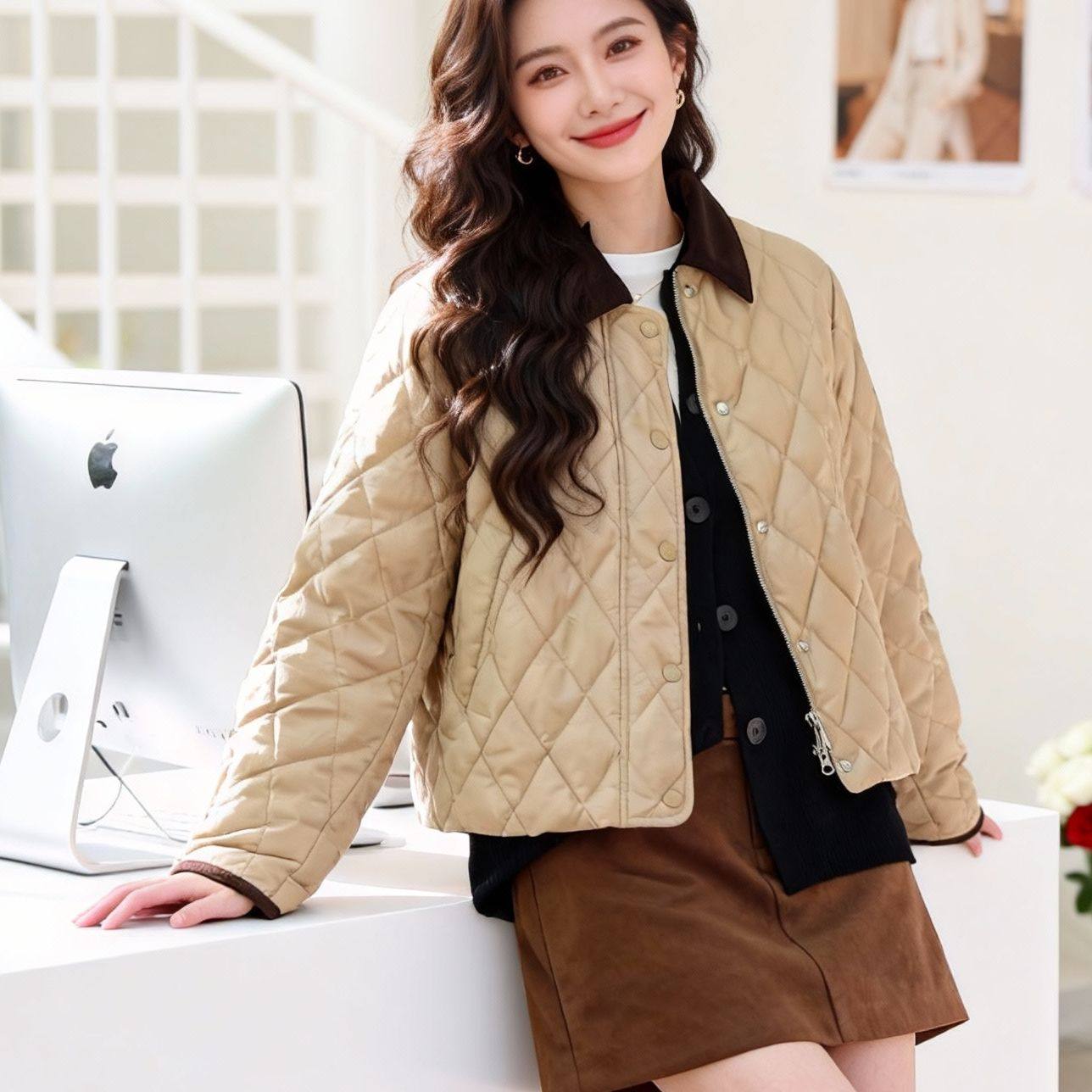 2025秋冬巴恩风女短款复古轻薄棉服翻领时尚拼接外套QD82372