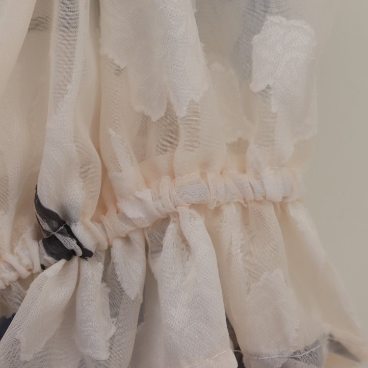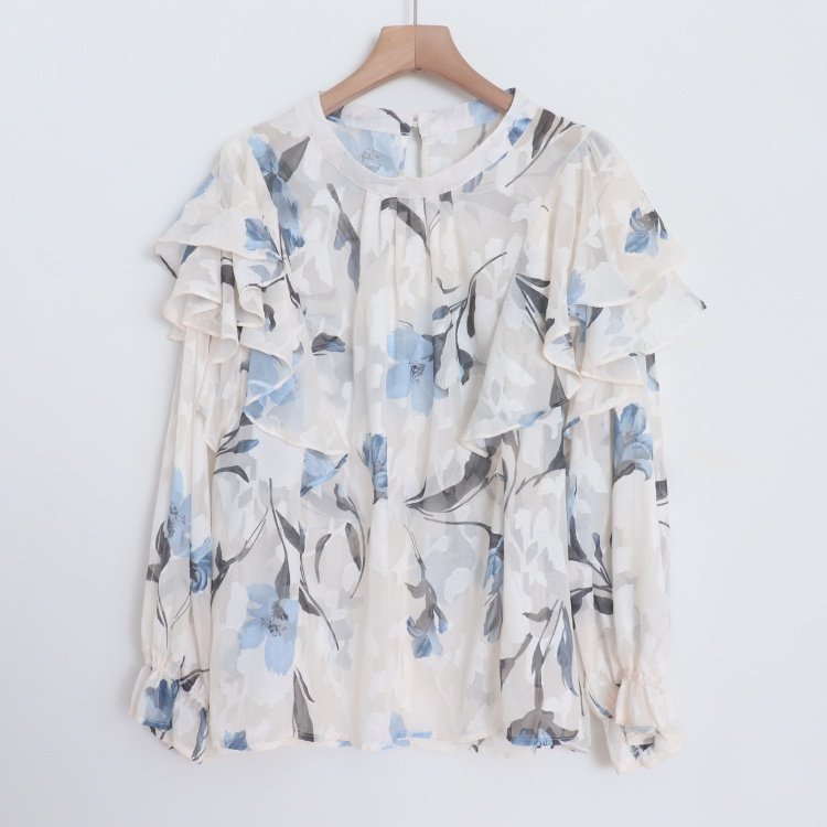 首页> 女装> D09076日单新款客供后纽扣圆领套头宽松女优雅气质印花喇叭袖衬衫