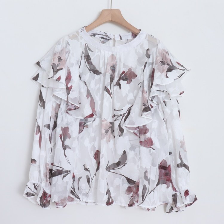 D09076日单新款客供后纽扣圆领套头宽松女优雅气质印花喇叭袖衬衫