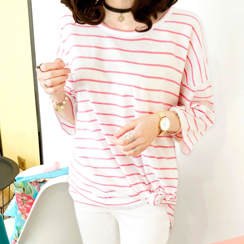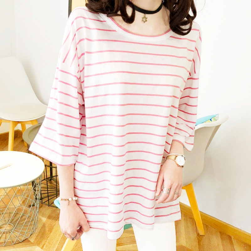 韩国东大门2023夏装新款宽松中长款圆领短袖细横条纹t恤女韩版潮