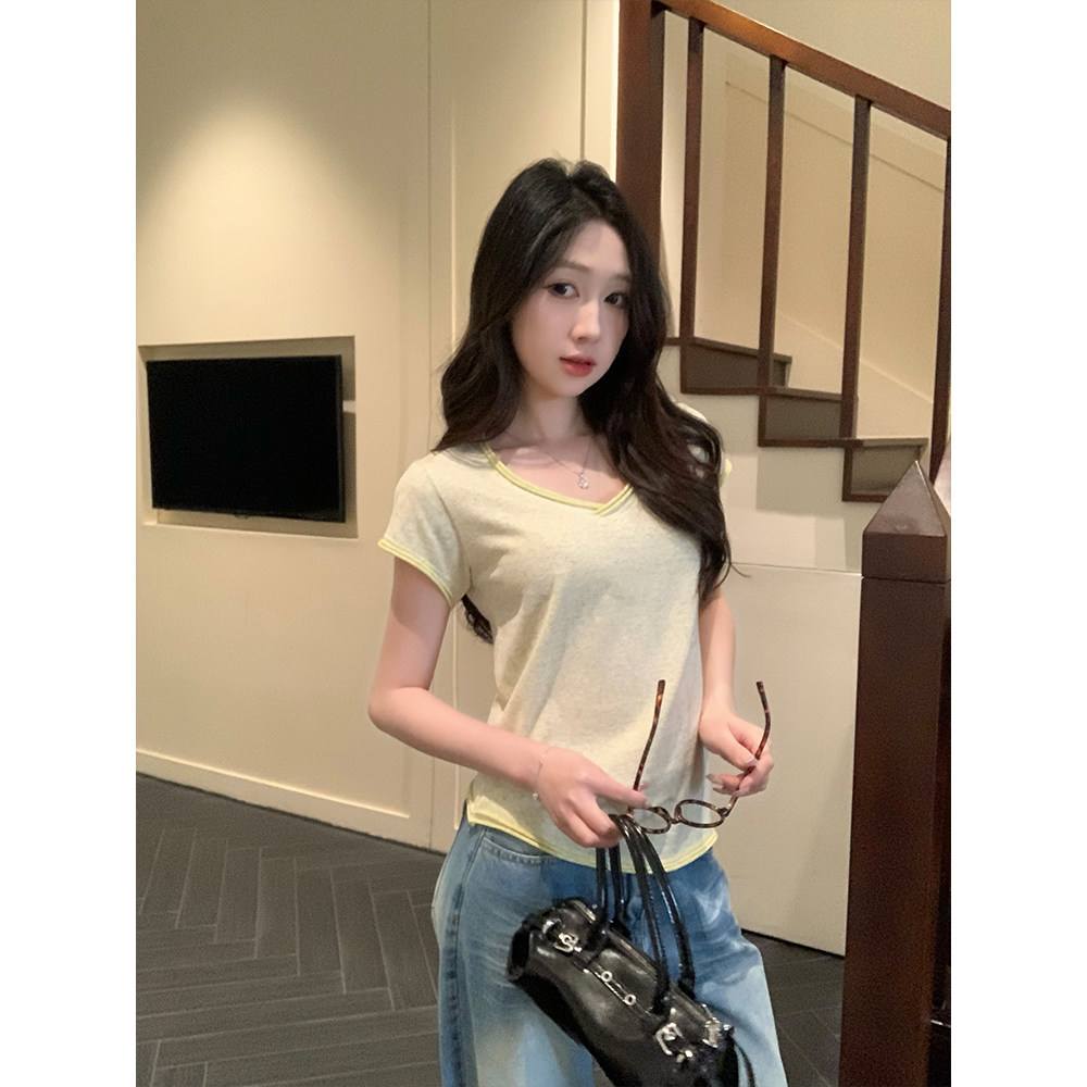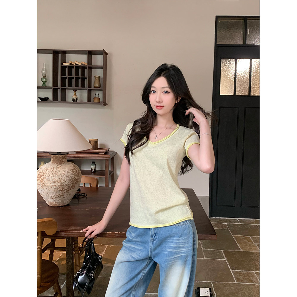 铅笔莓莓竹节棉撞色V领透气t恤女夏季新款设计感小众宽松短袖上衣