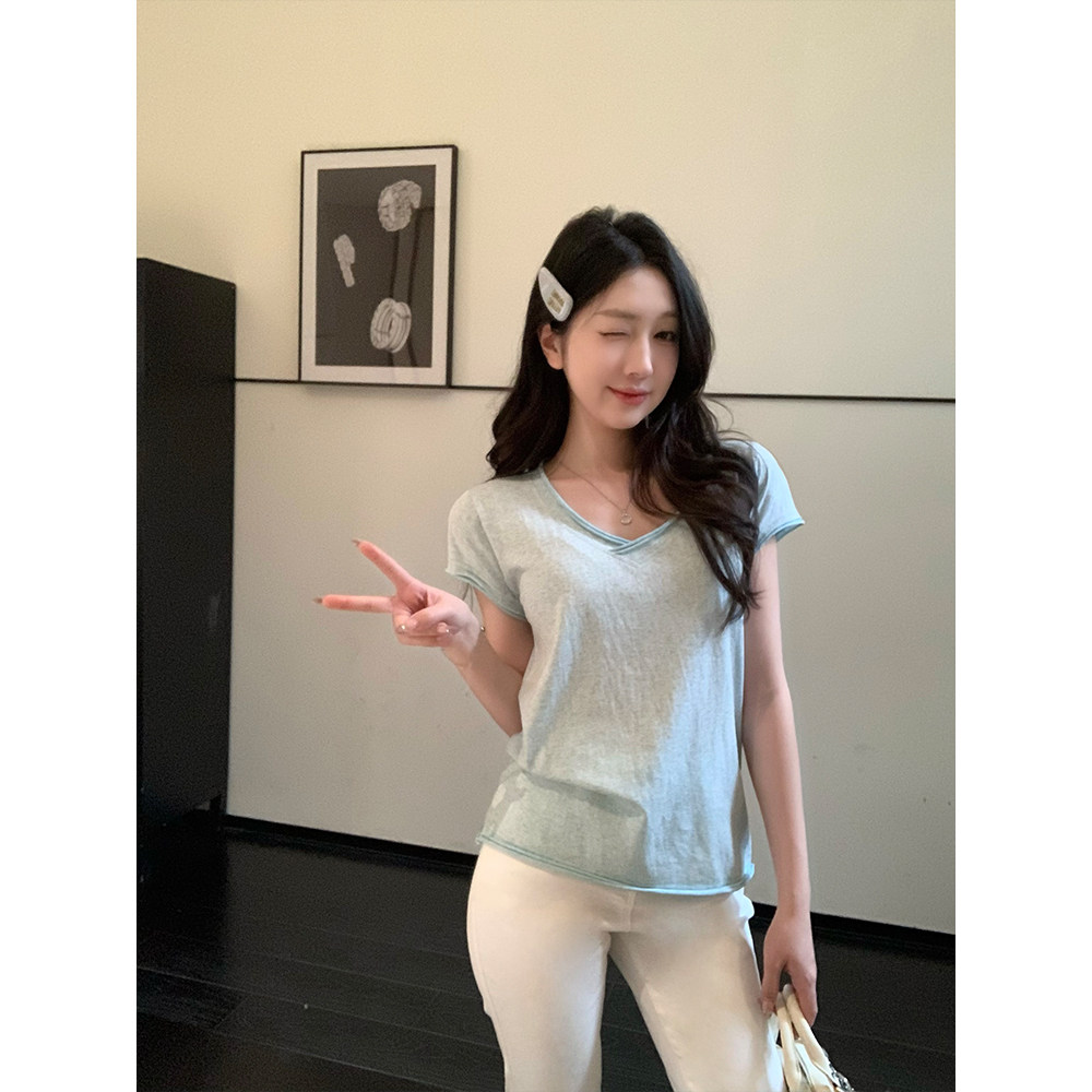 首页> 女装> 铅笔莓莓竹节棉撞色V领透气t恤女夏季新款设计感小众宽松短袖上衣