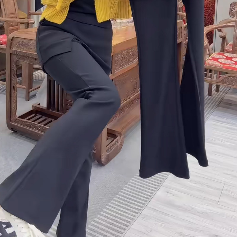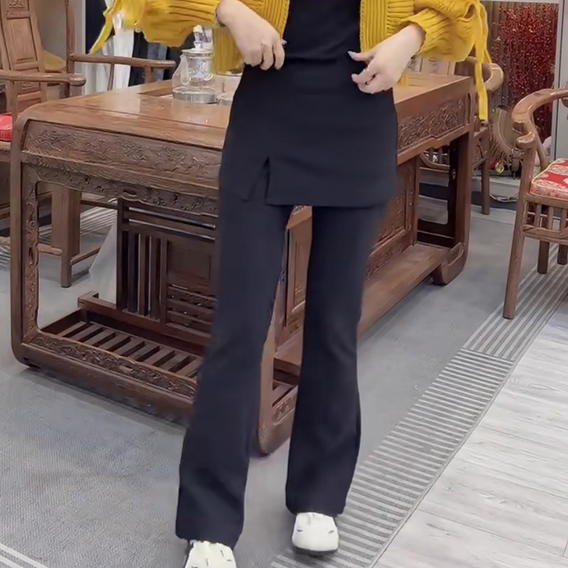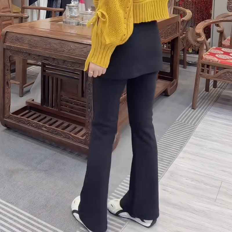 时尚百搭松紧高腰假两件围裙裤休闲弹力净版简约显瘦秋冬微喇长裤