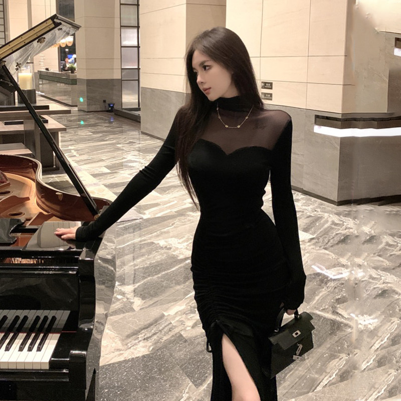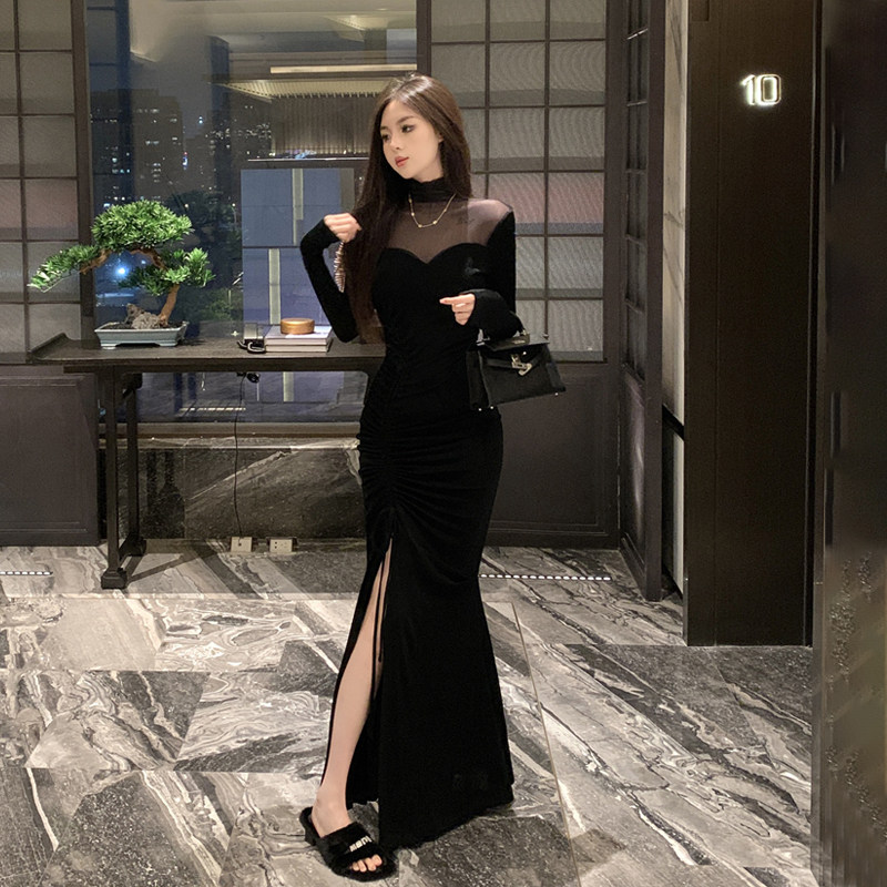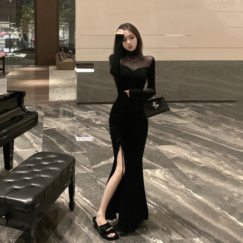 首页> 女装> 轻奢高端气质拼接网纱小黑裙高腰显身材修身开叉露腿鱼尾连衣裙女