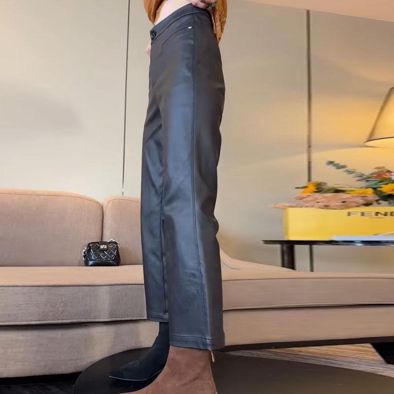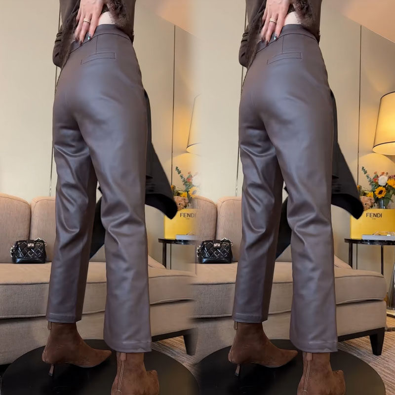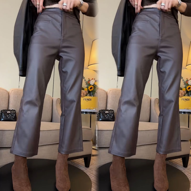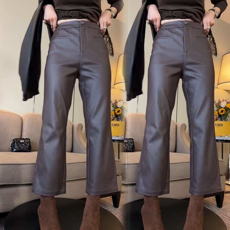 秋冬时尚新款2025秋冬休闲裤纯色高腰净版弹力涂层九分微喇皮裤
