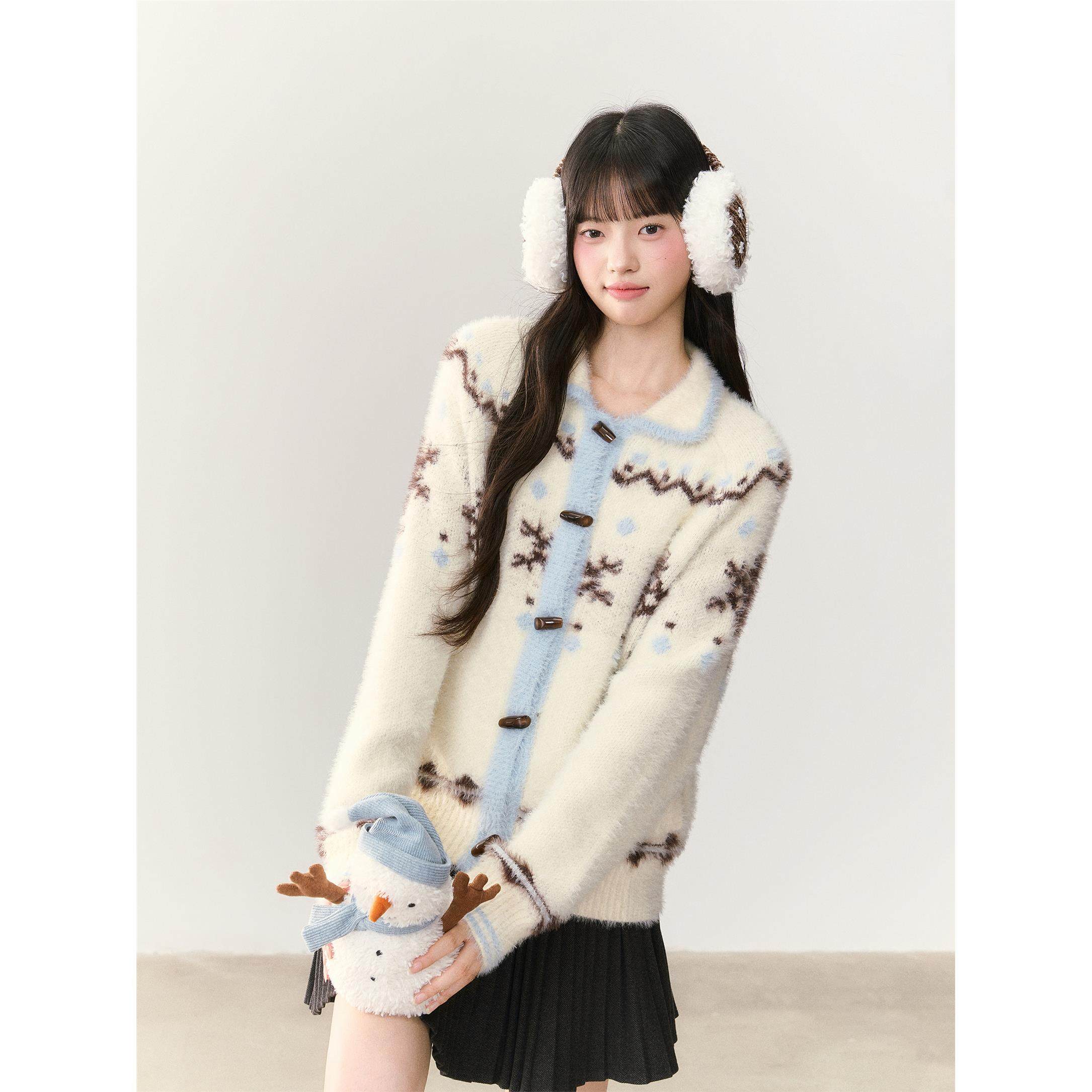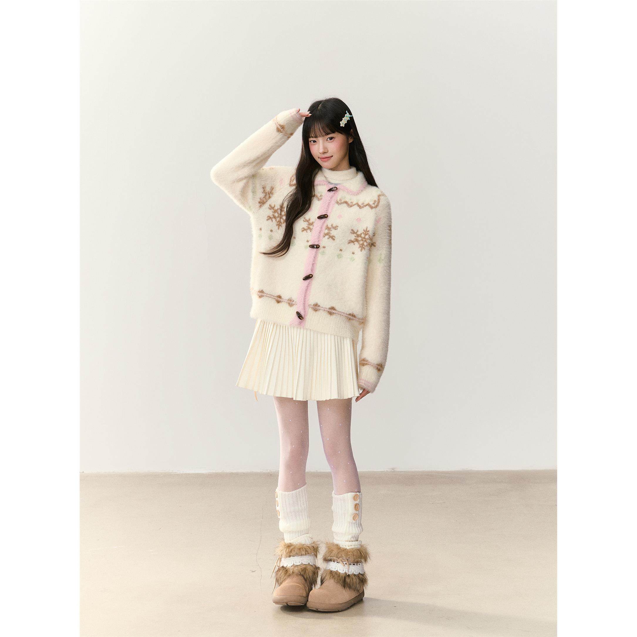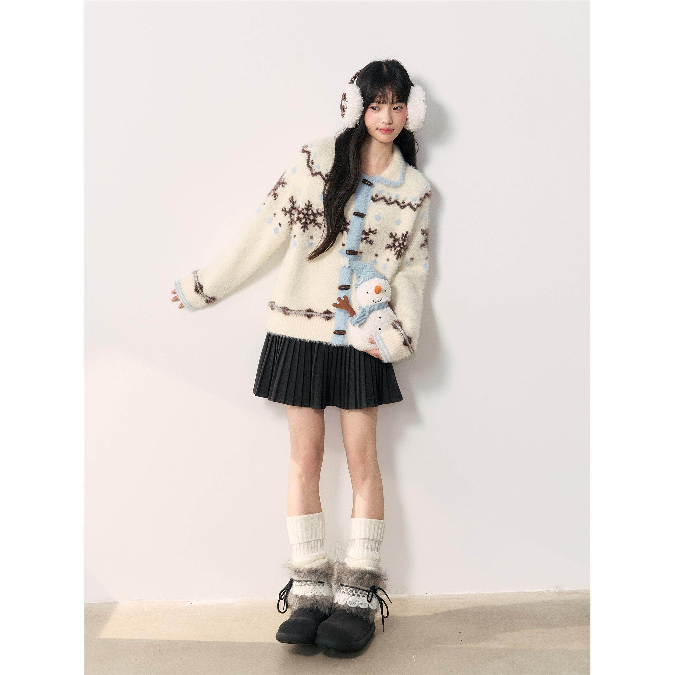 umoumo乌蘑休闲慵懒软糯百搭撞色彷貂毛费尔岛雪花图案开衫毛衣