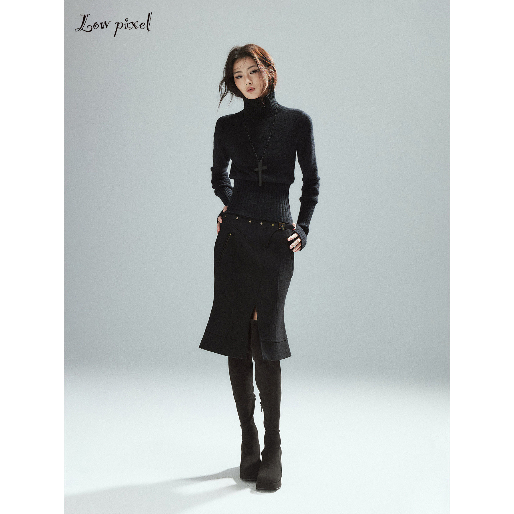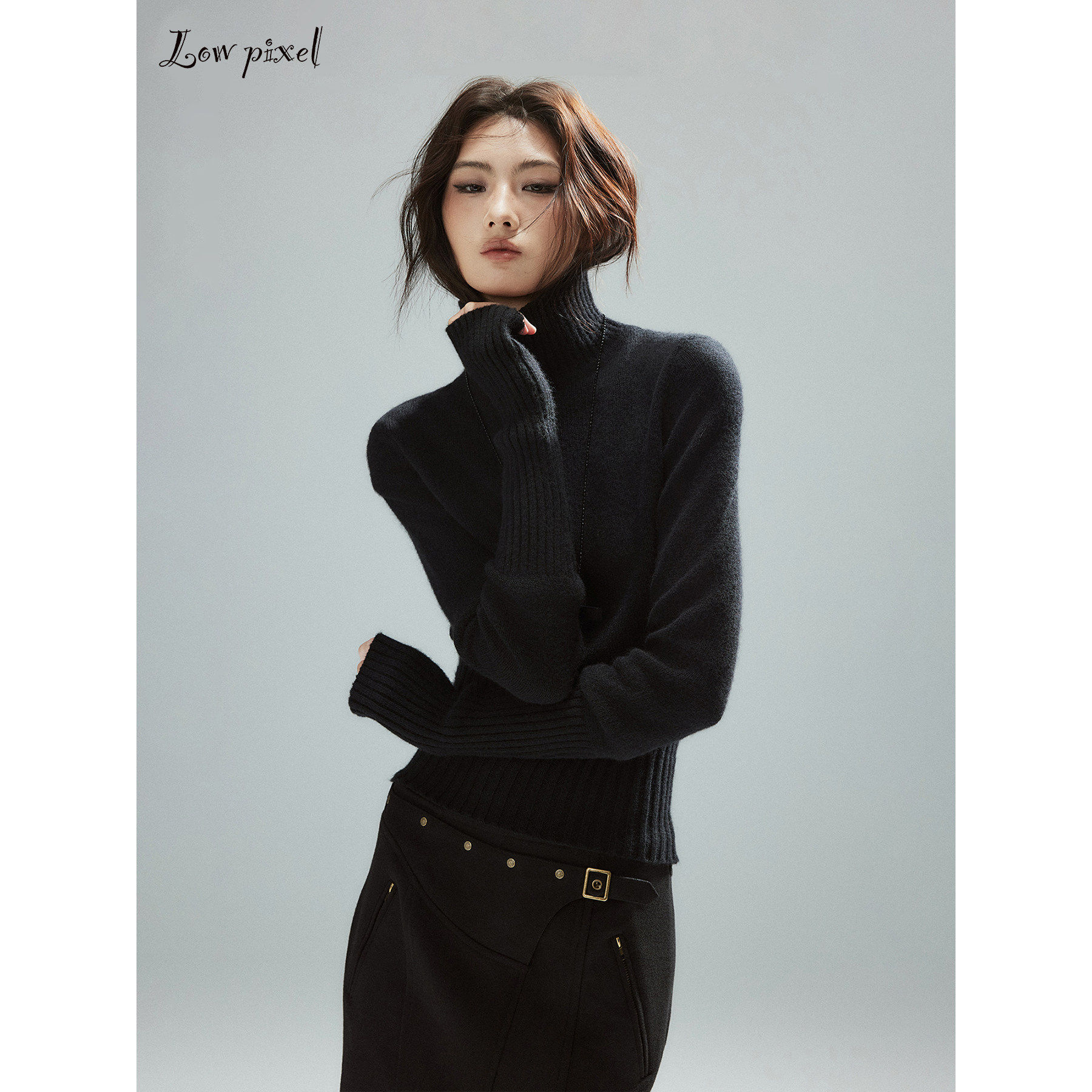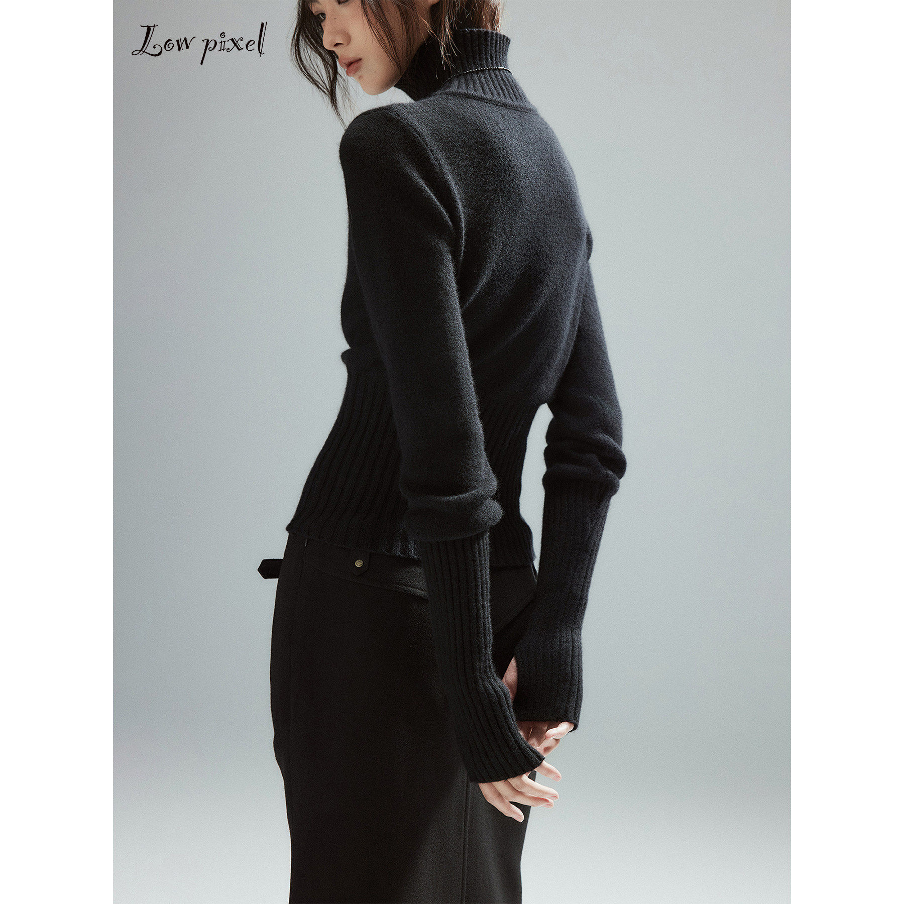 Low pixel低像素 羊毛黑色高领毛衣女羊绒罗纹修身收腰长袖针织衫