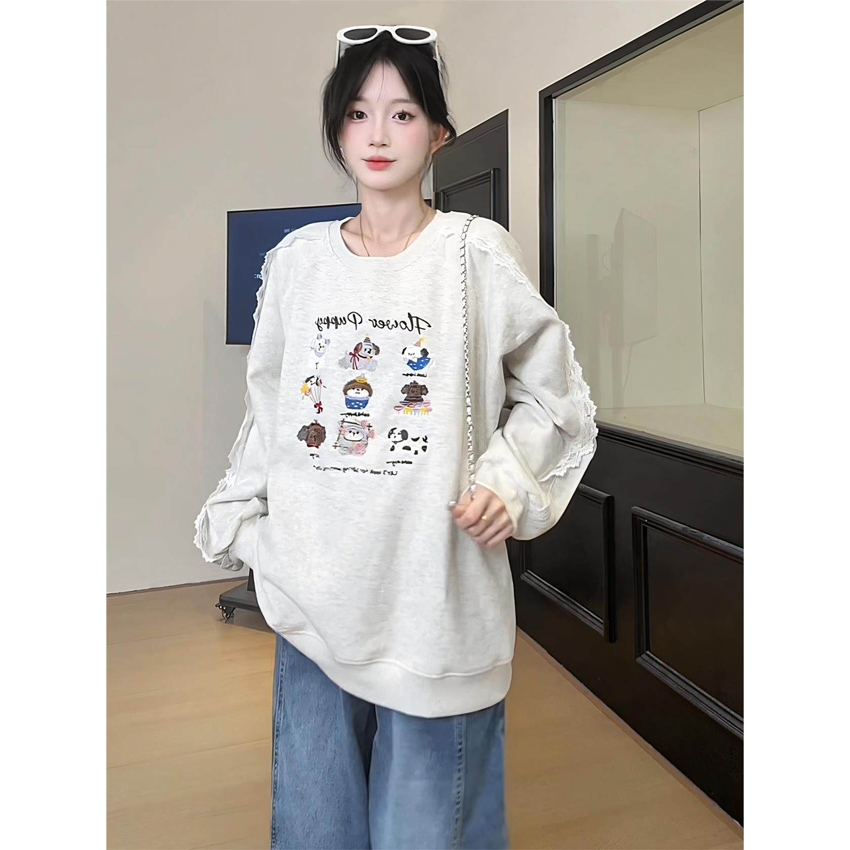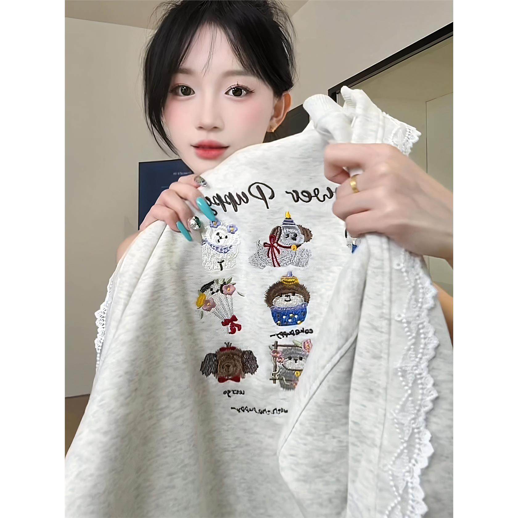 灰色小狗刺绣卫衣女2025新款秋季蕾丝拼接宽松慵懒风无帽圆领上衣
