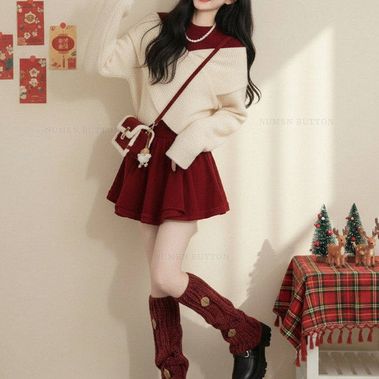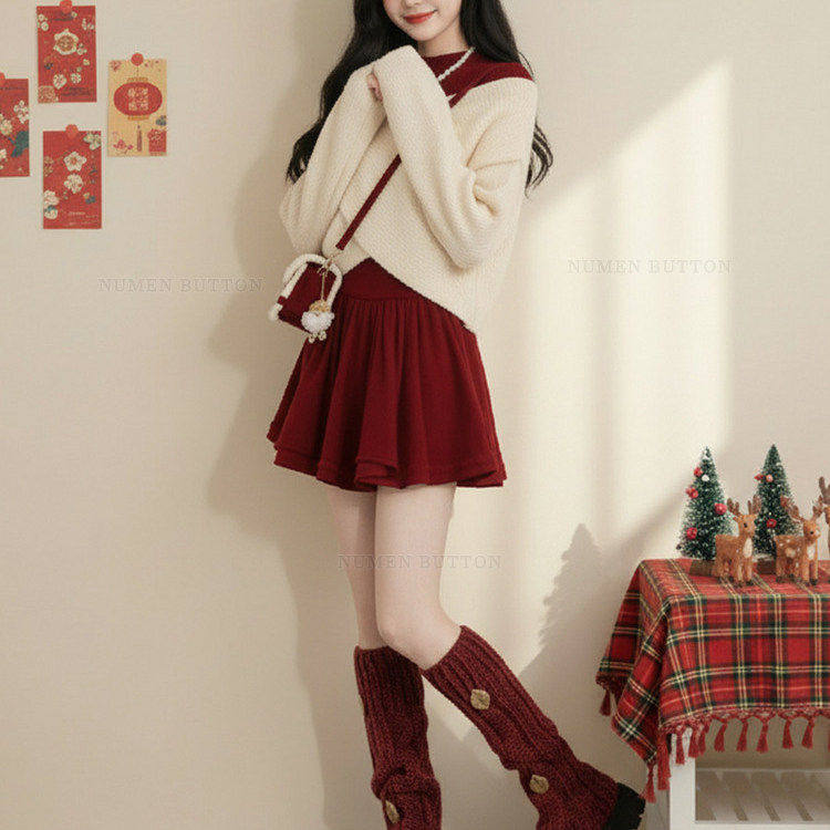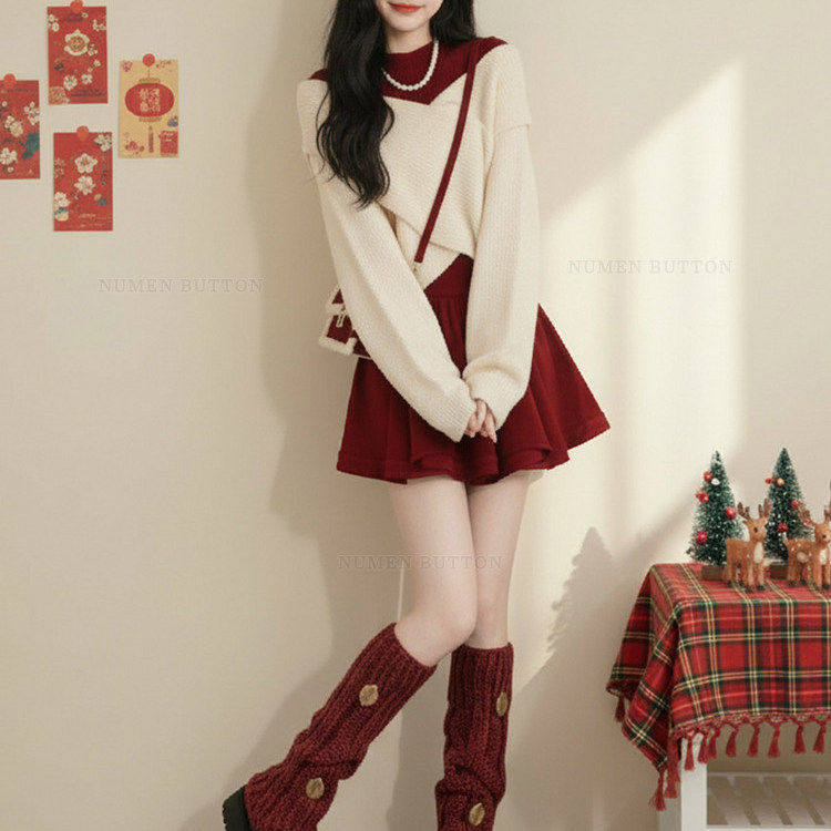 大尺码秋冬季甜美风套装女红色新年战袍毛衣搭配气质洋装两件套