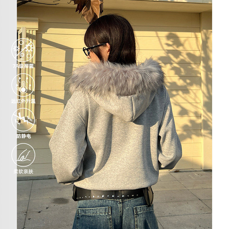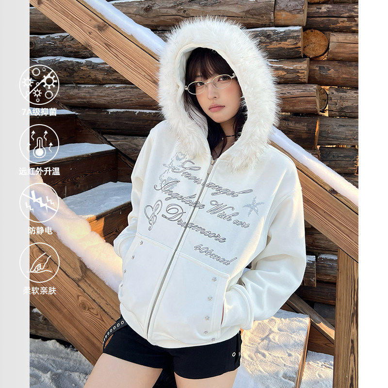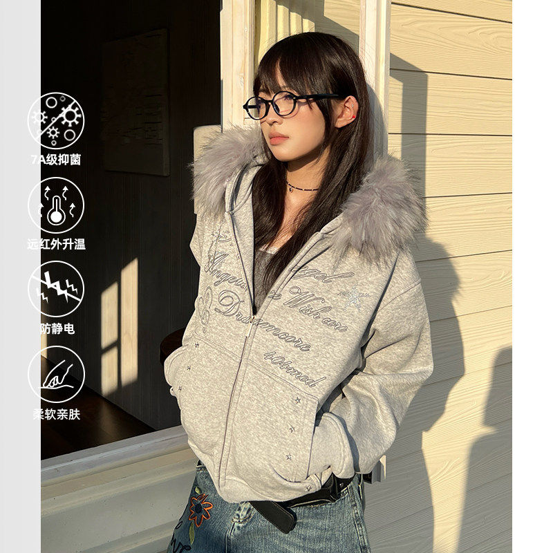 404MOB烫钻字母设计冬季大毛领加厚加绒外套女款短款连帽开衫卫衣