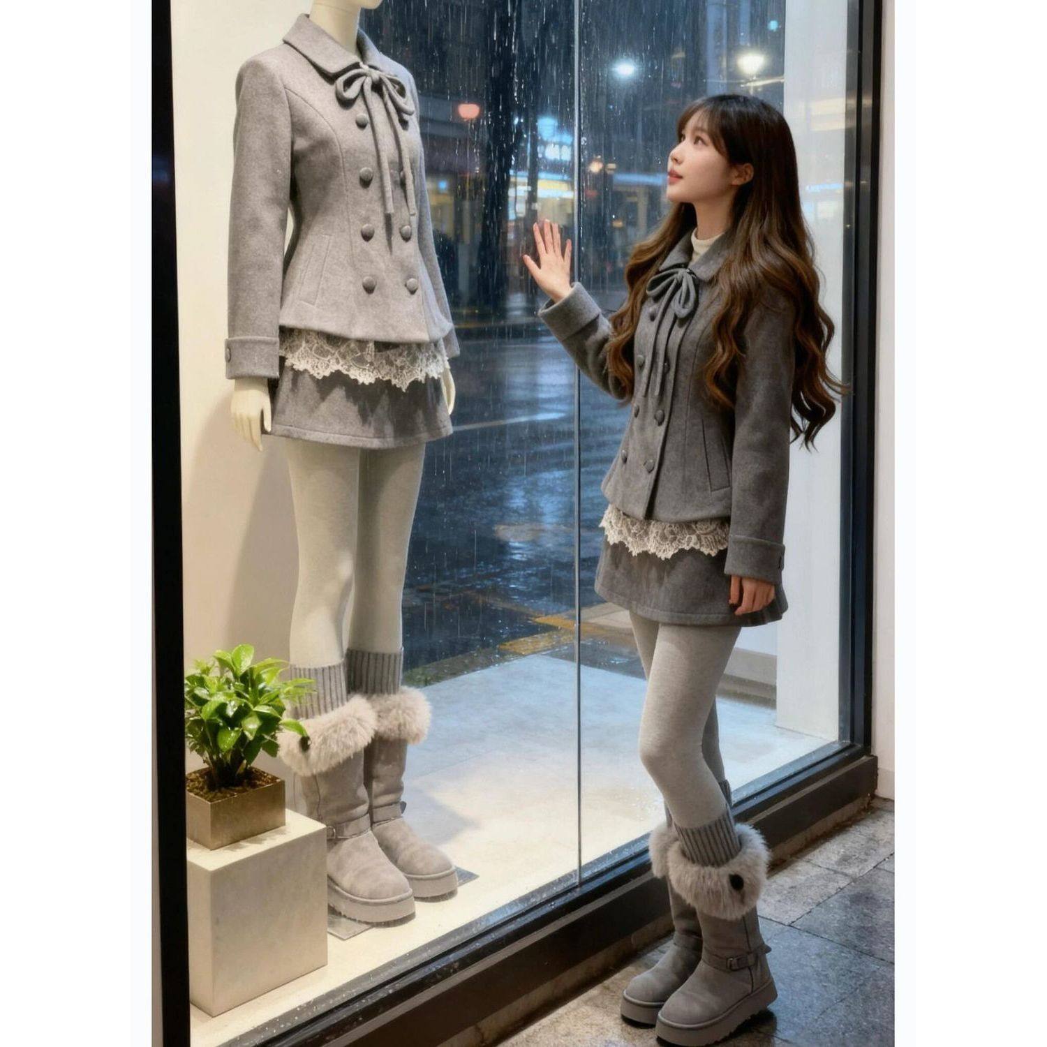 【赫尔小姐】冬季格雷系蝴蝶结外套+蕾丝打底衫+收腰半身裙三件套