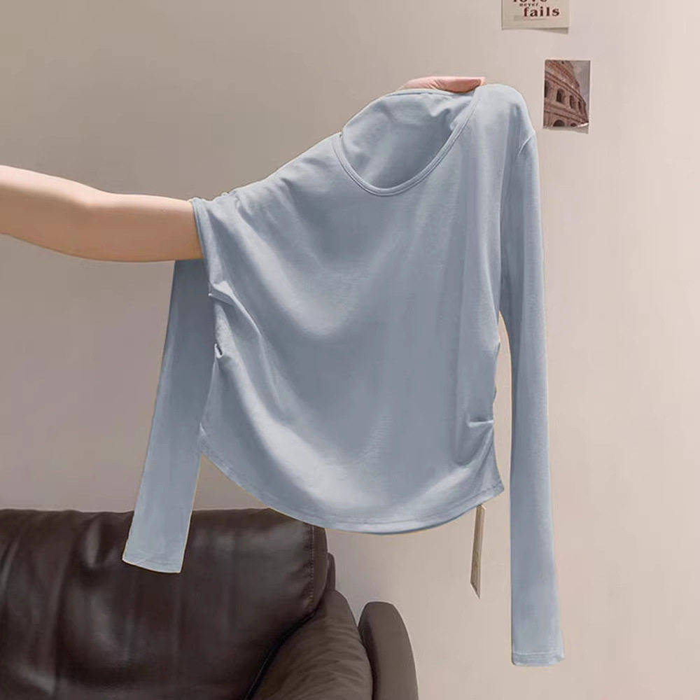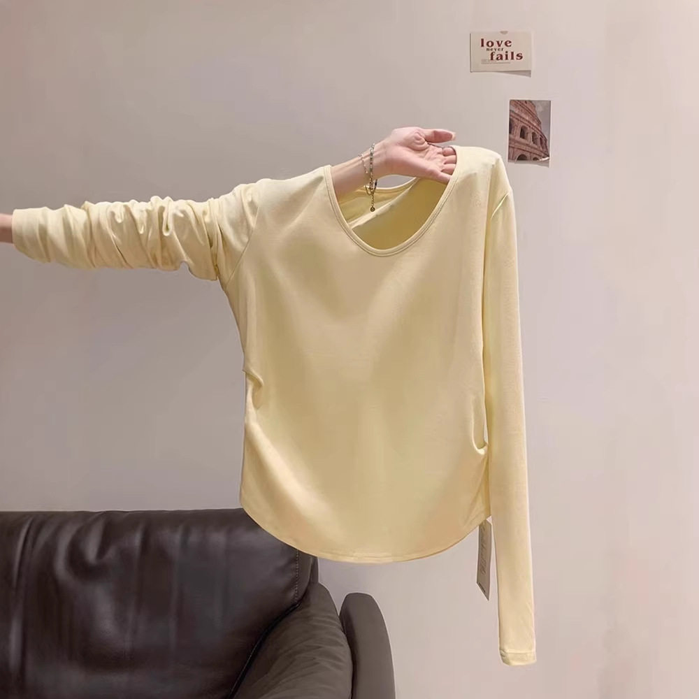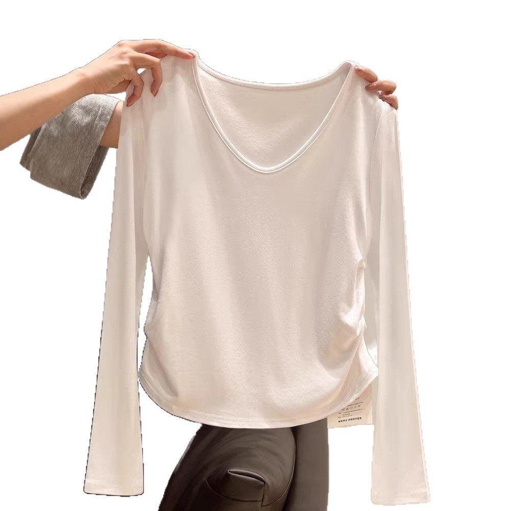 显白低v领长袖T恤女内搭春季新款甜辣妹褶皱收腰打底衫上衣百搭