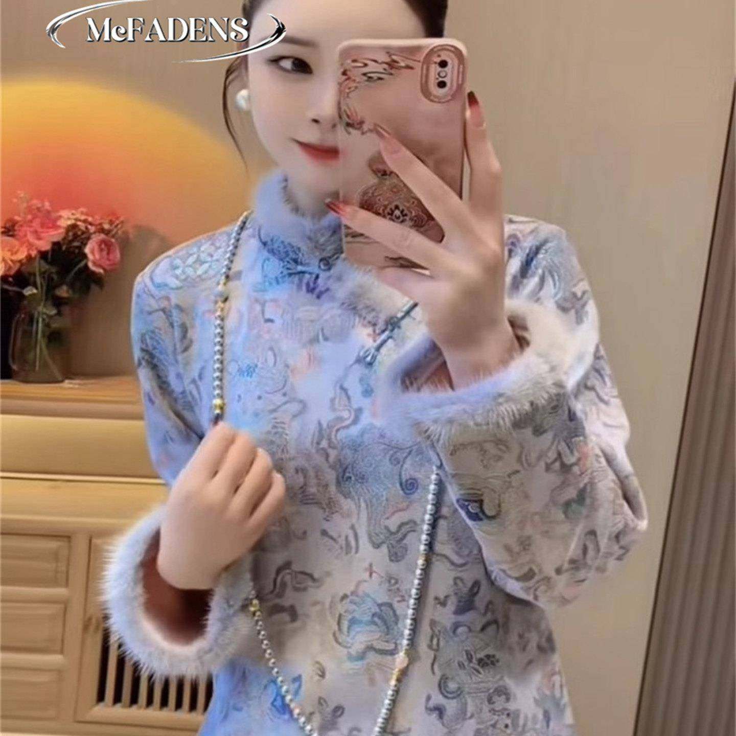 香港冬季新款新中式加绒旗袍裙女国风轻奢重工印花盘扣立领连衣裙