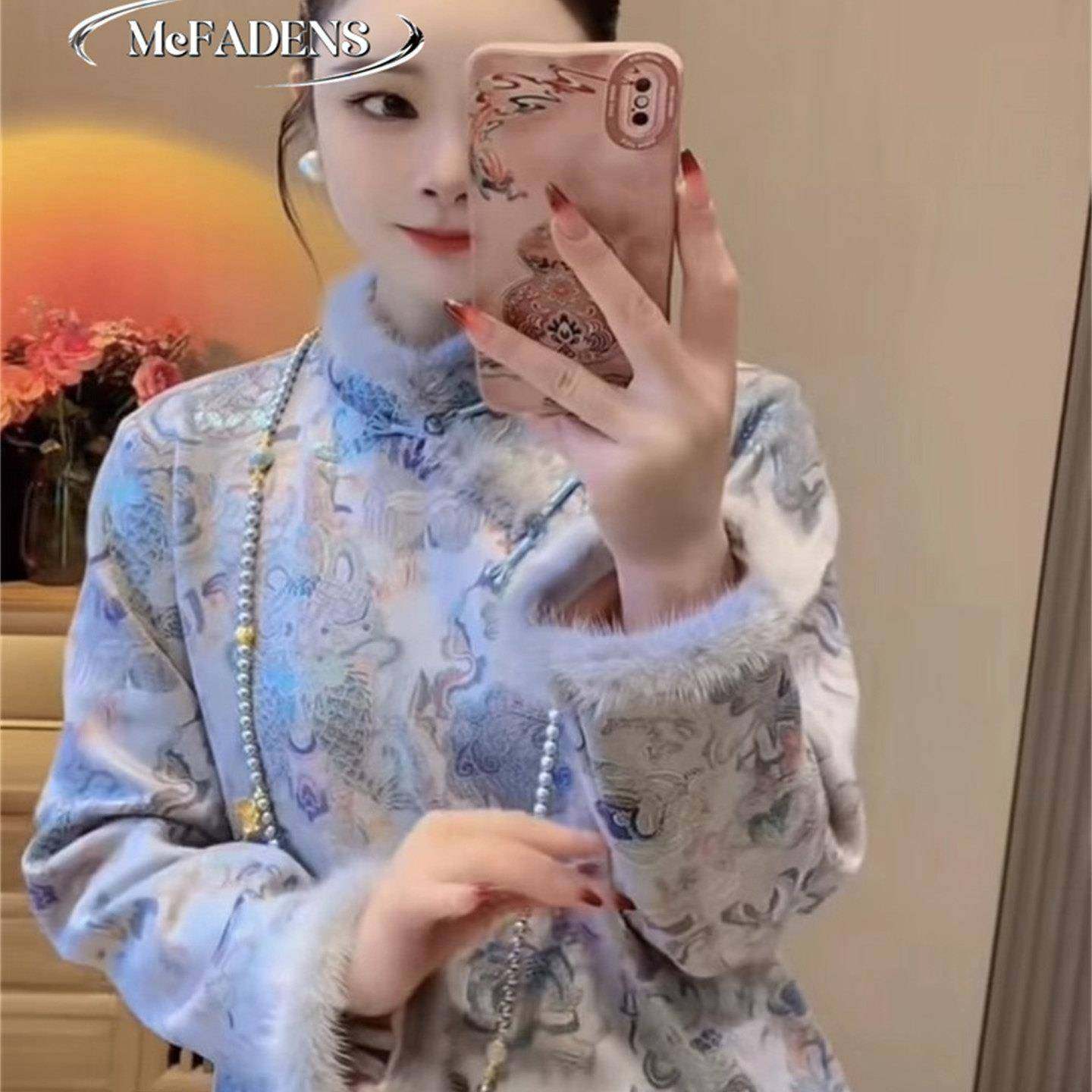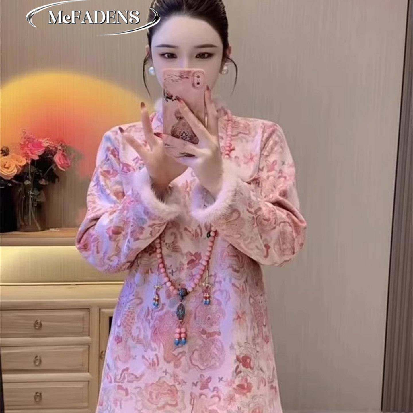 首页> 女装> 香港冬季新款新中式加绒旗袍裙女国风轻奢重工印花盘扣立领连衣裙