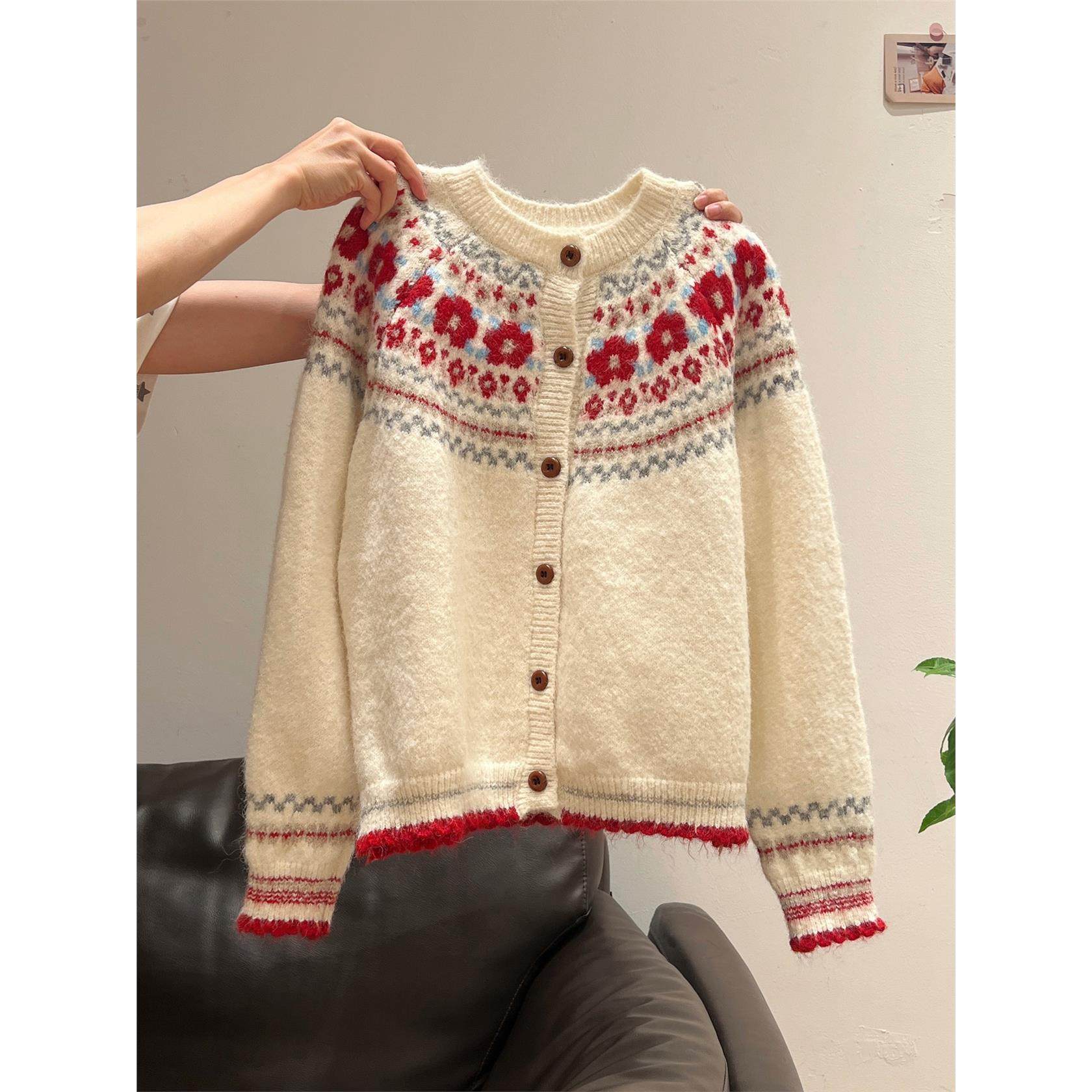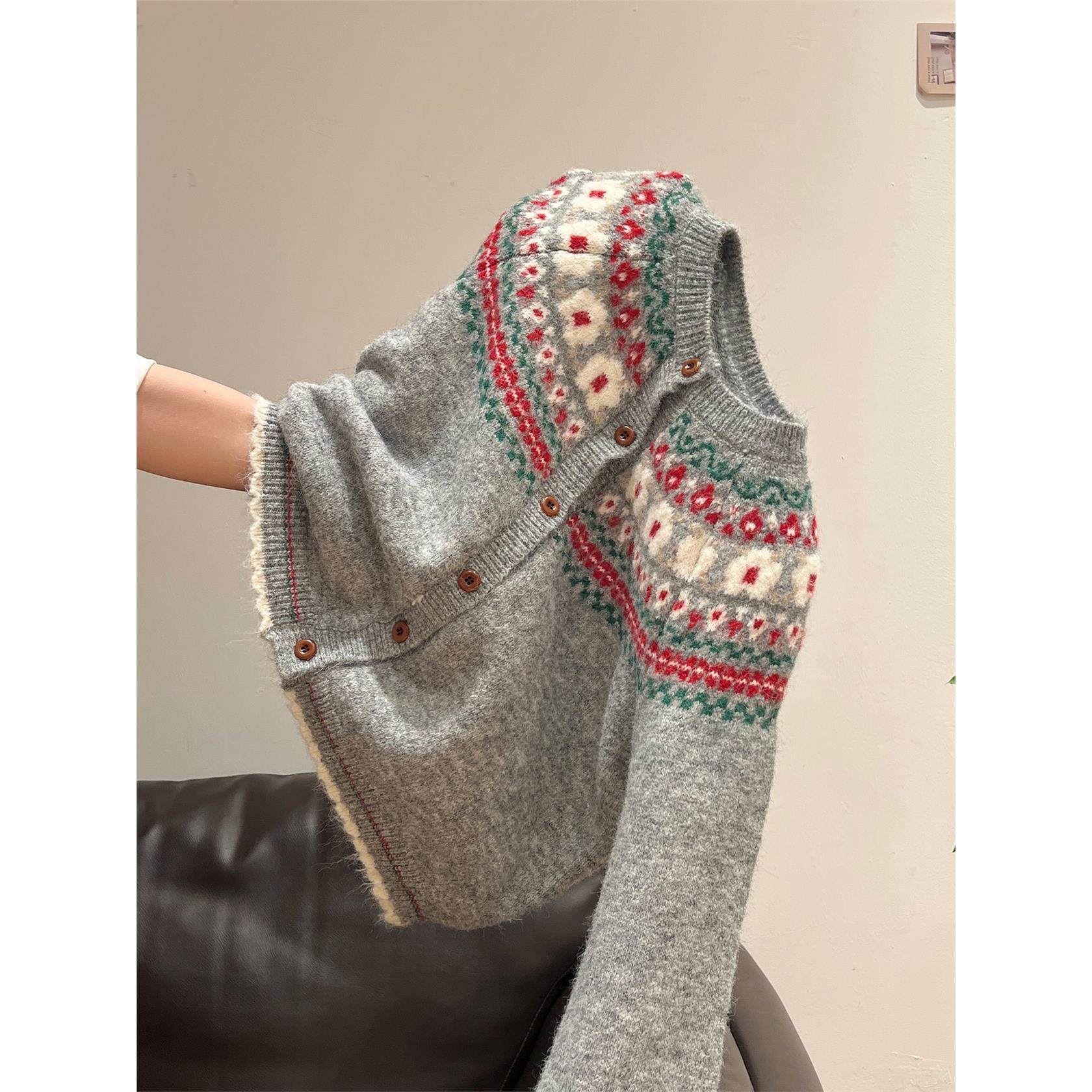 费尔岛提花高级感毛衣外套女2025年秋季外穿宽松撞色针织开衫上衣