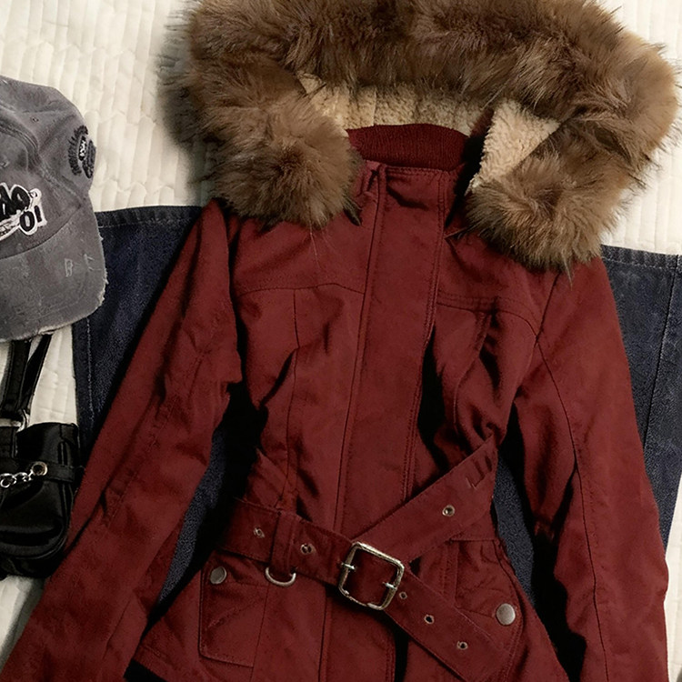 复古红色vintage毛领连帽外套女秋冬季新款设计感小众派克服上衣