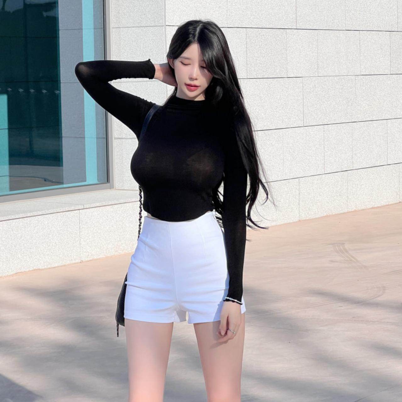 韩国东大门新款纯欲辣妹风~半高领紧身短款露腰长袖打底T恤女上衣