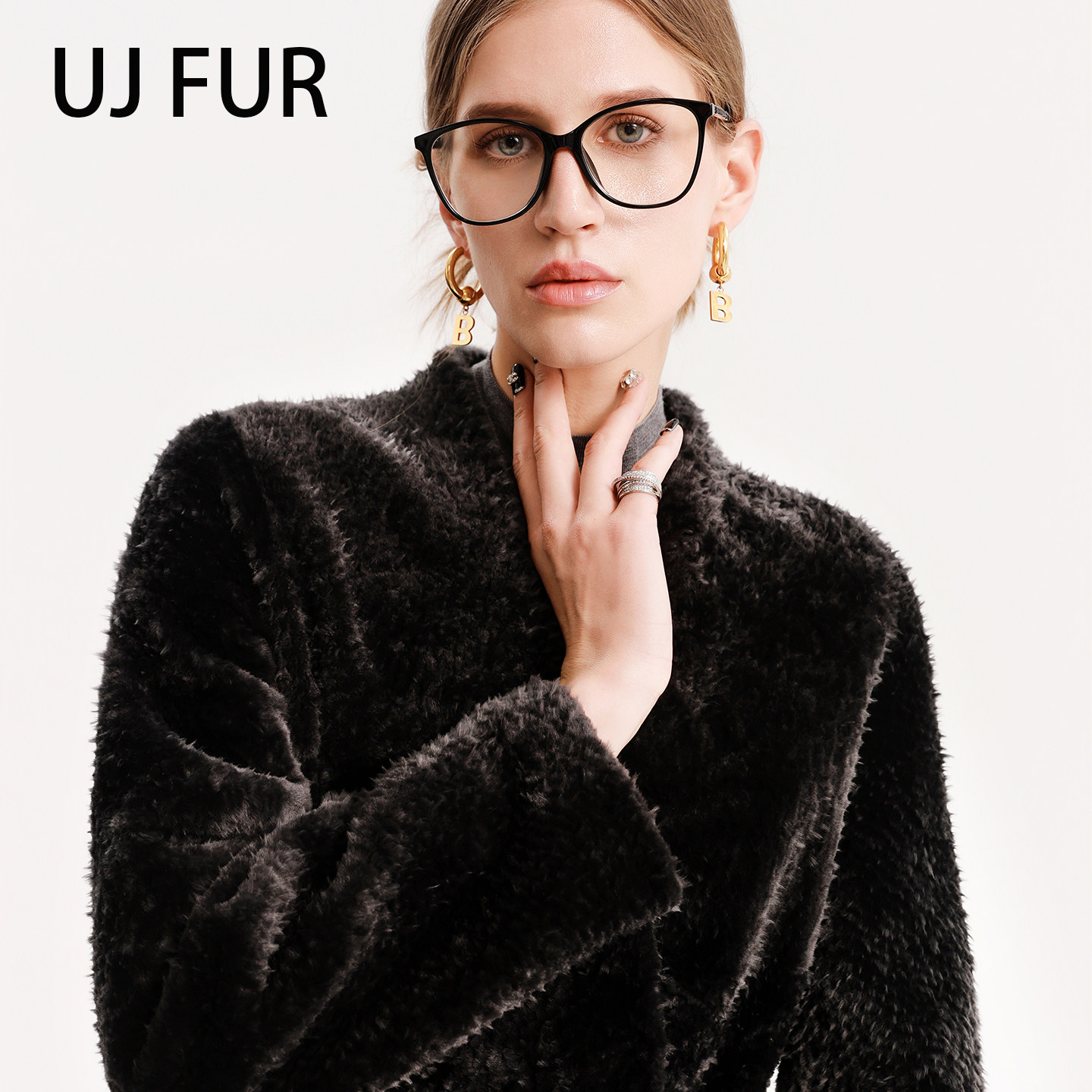 UJ/轻奢极简风石墨灰皮毛一体长款外套女收腰羊羔毛皮草大衣