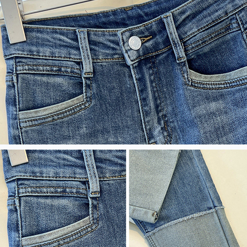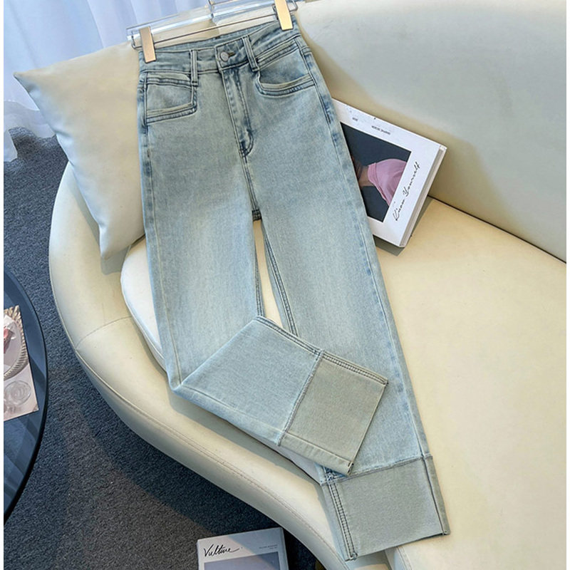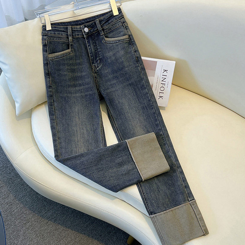 啄木鸟爆款复古烟管牛仔裤女秋冬高腰卷边九分裤小个子加绒直筒裤