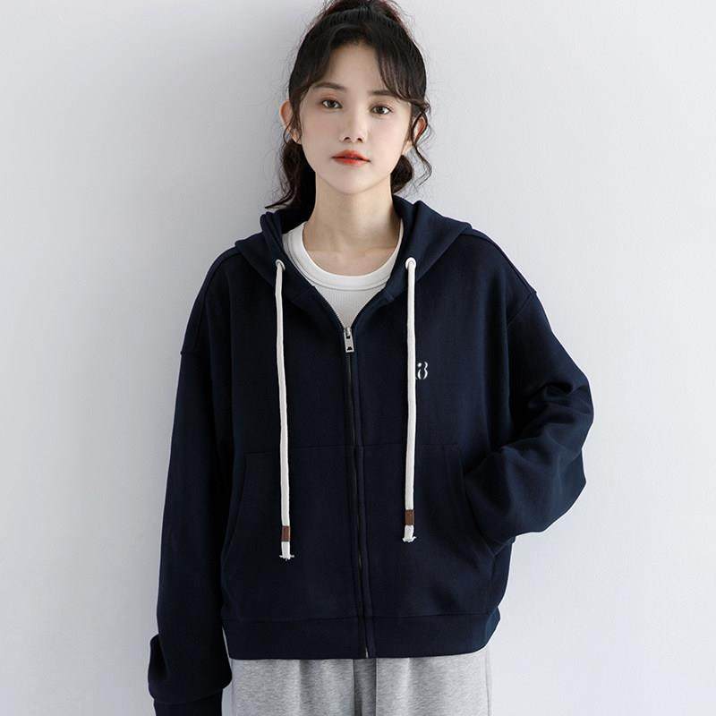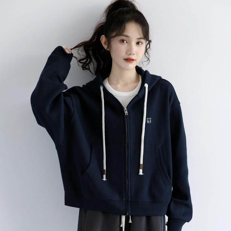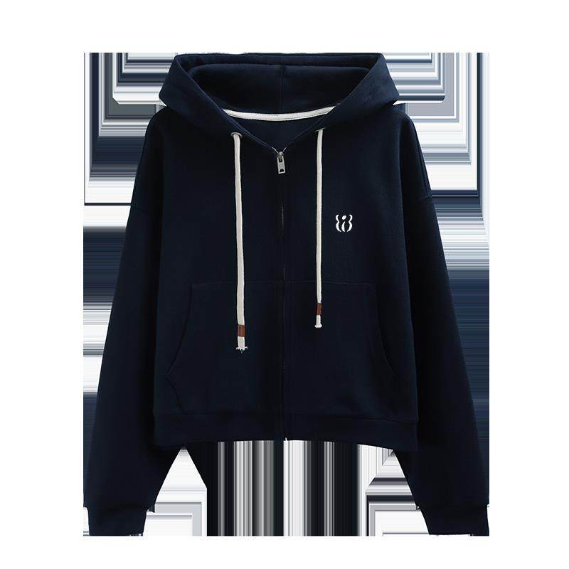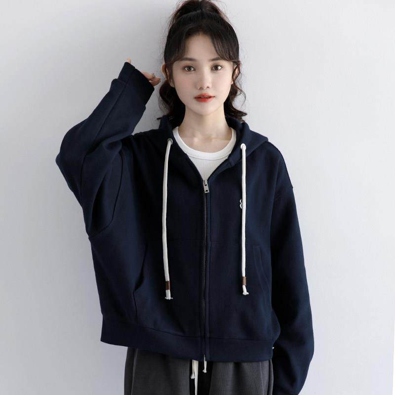 韩国2025新款藏蓝色连帽卫衣外套女春秋拉炼开衫休闲短款上衣冬潮