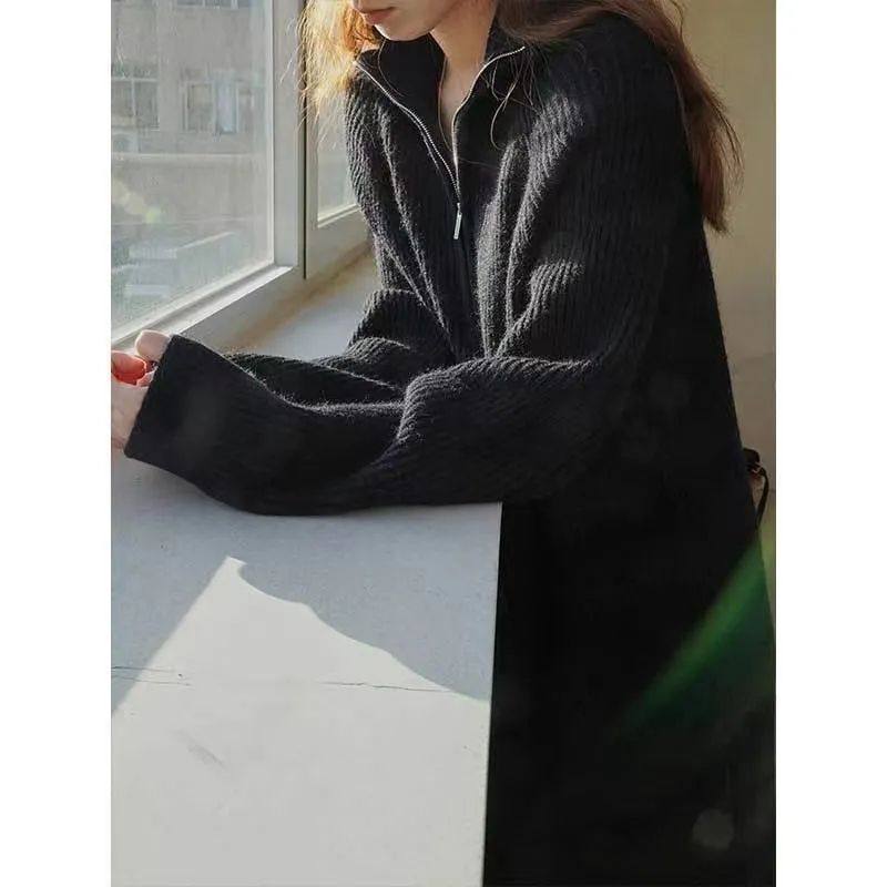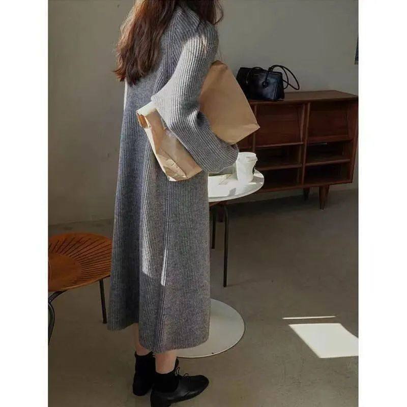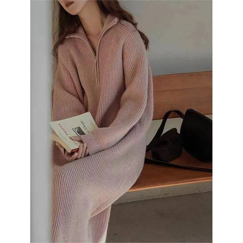 秋冬季中长款毛衣裙翻领拉链内搭加厚针织卫衣连衣裙女配大衣外穿