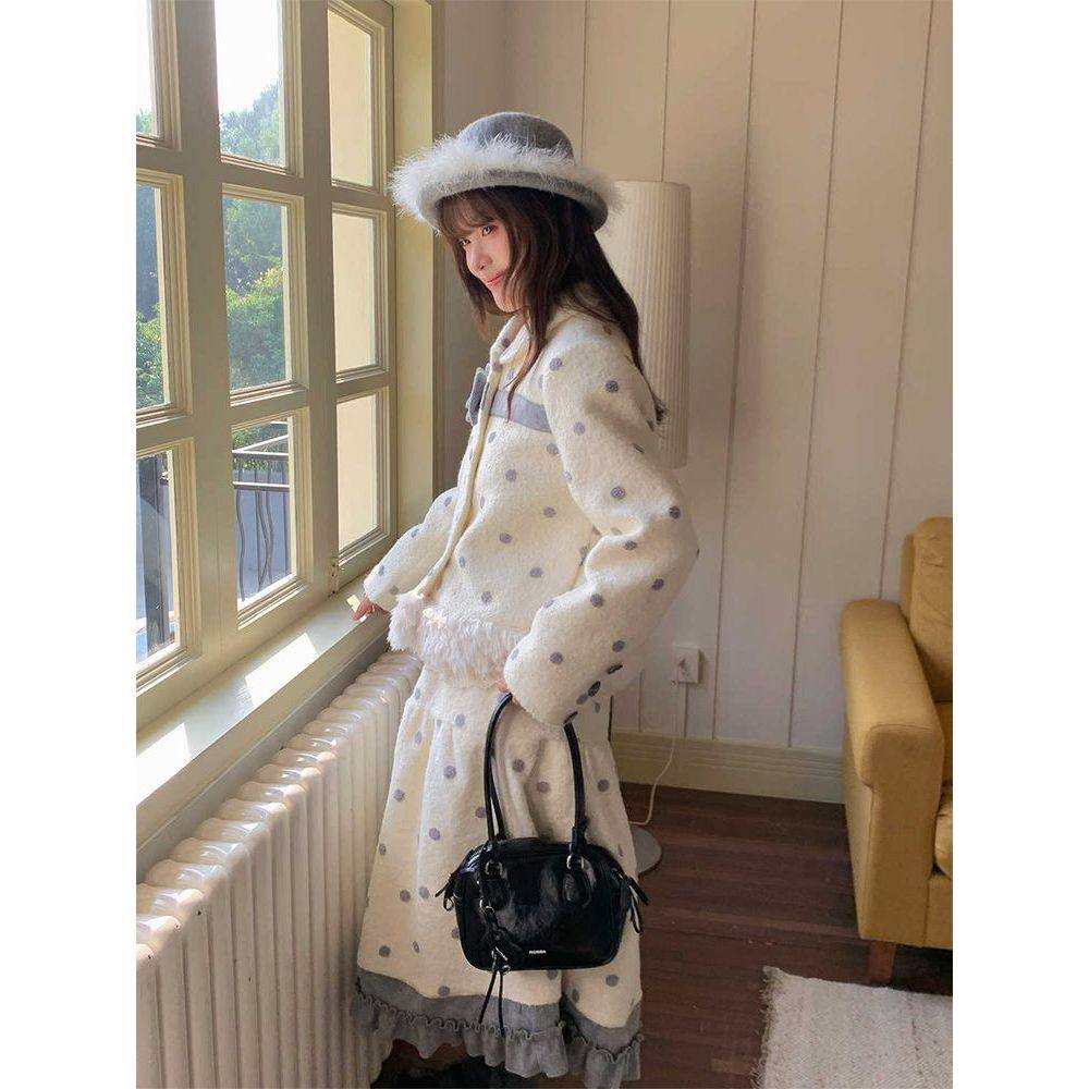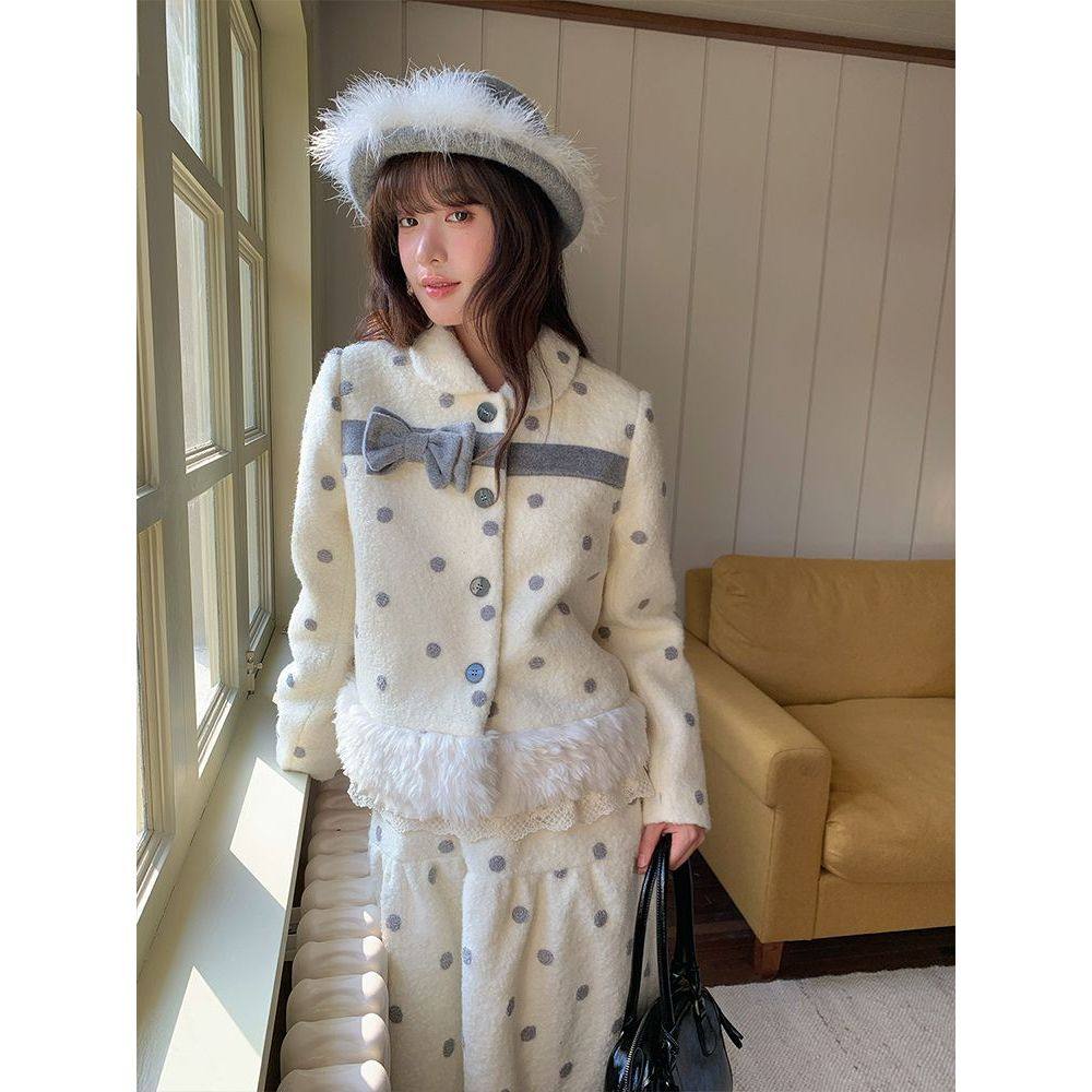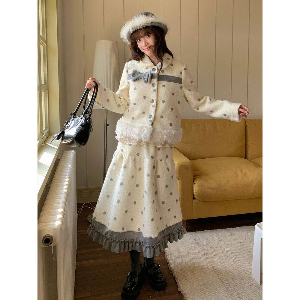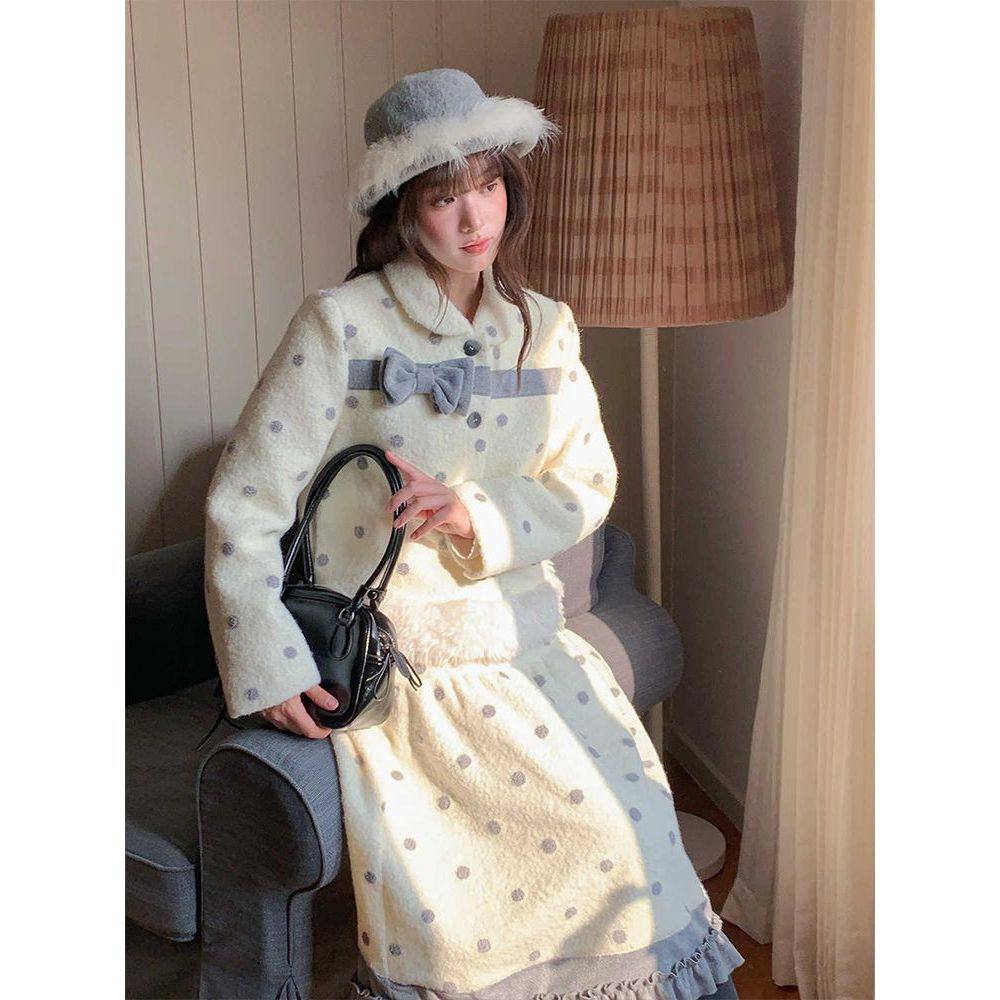 芋泥布蕾 2025冬季新款蝴蝶结波点毛呢外套波点拼接长裙女两件套