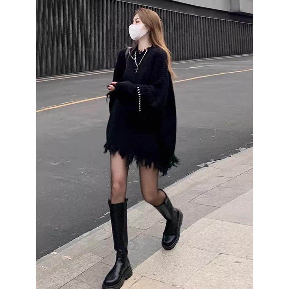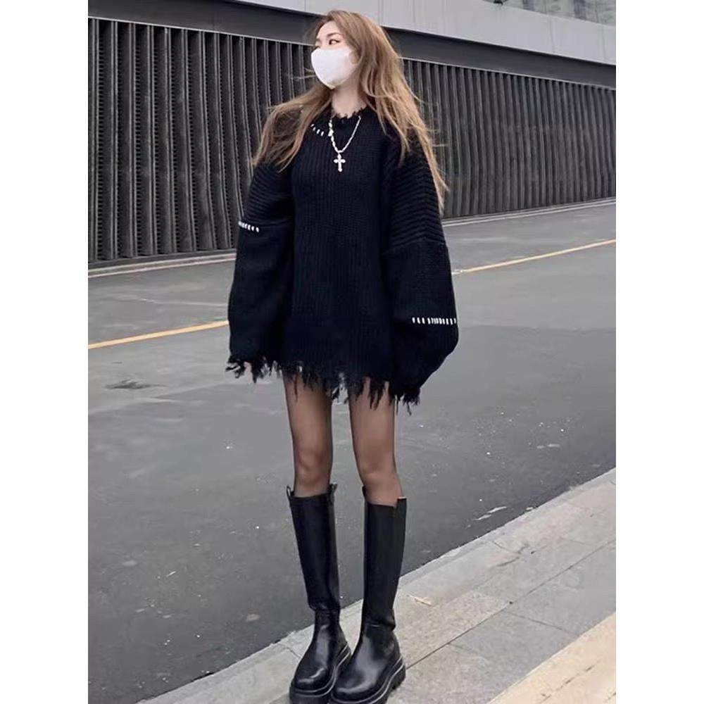 日系套头中长款穿搭针织上衣女装慵懒风宽松加厚破洞毛边黑色毛衣