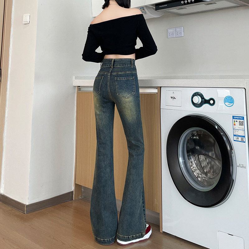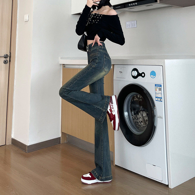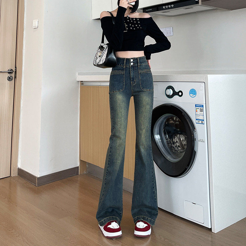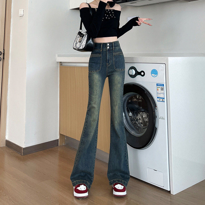 高腰双排扣微喇牛仔裤女春秋修身弹力怀旧覆古提臀马蹄喇叭长裤子
