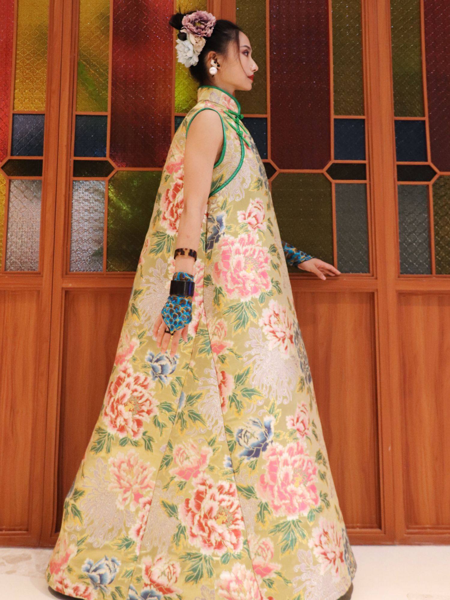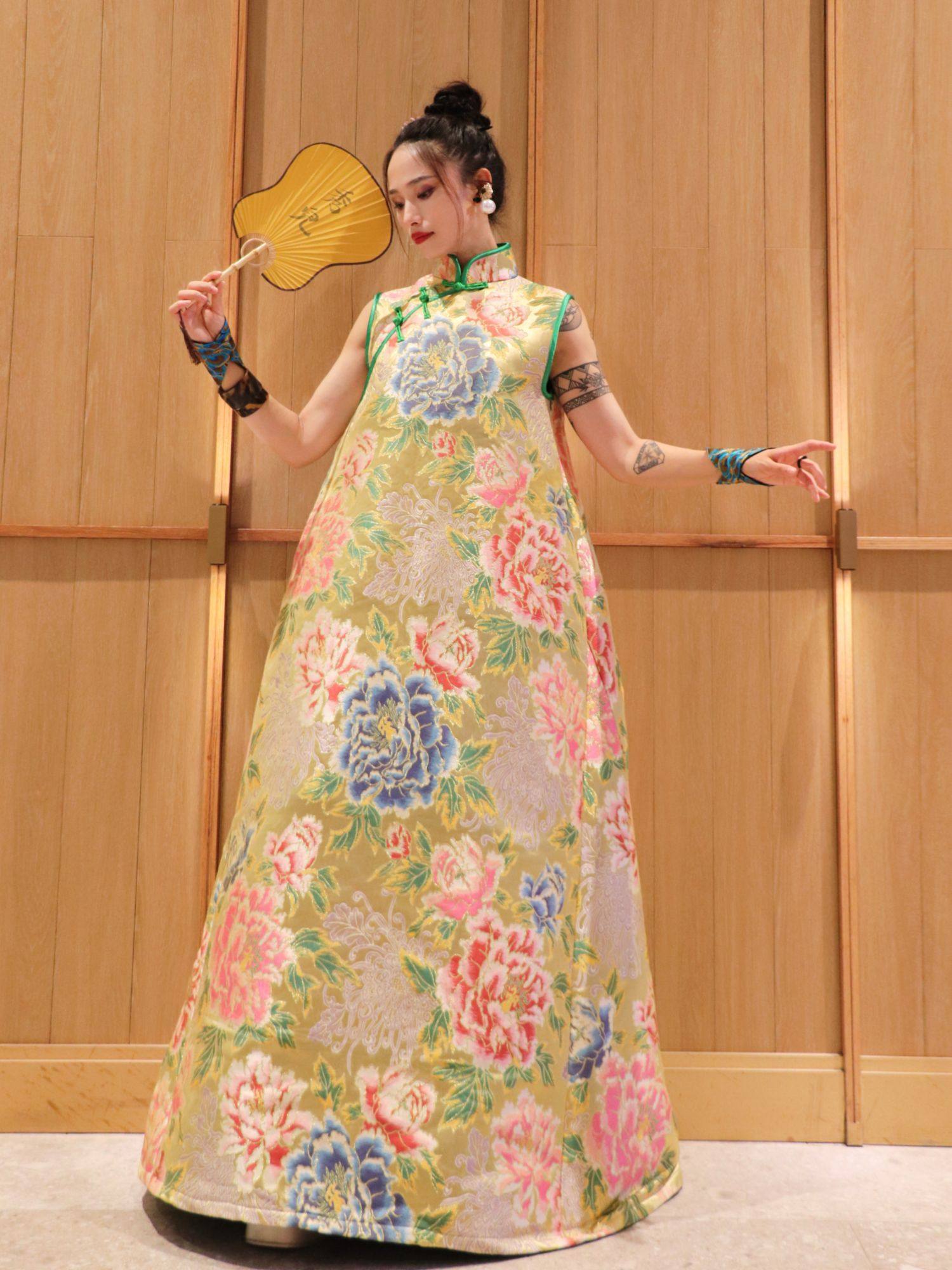 锦秀儿原创立体七彩牡丹花开富贵织锦中式立领无袖民族风大摆袍子