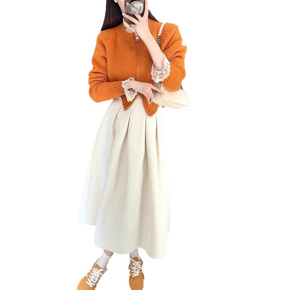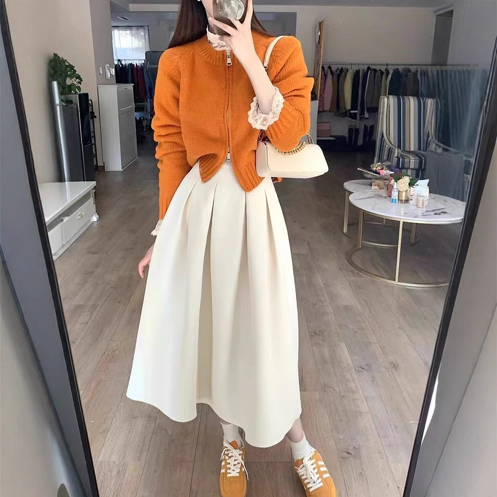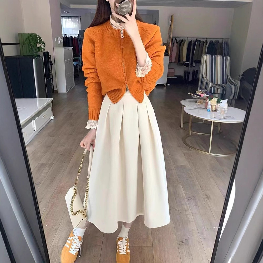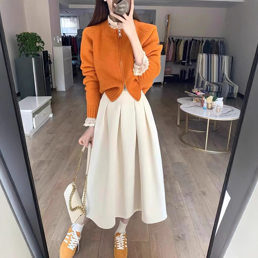 早春穿搭套装2024新款减龄双头拉链针织开衫+高腰百褶裙子两件套
