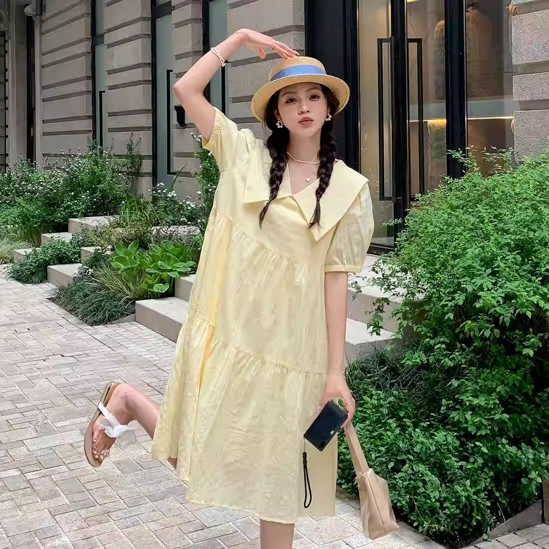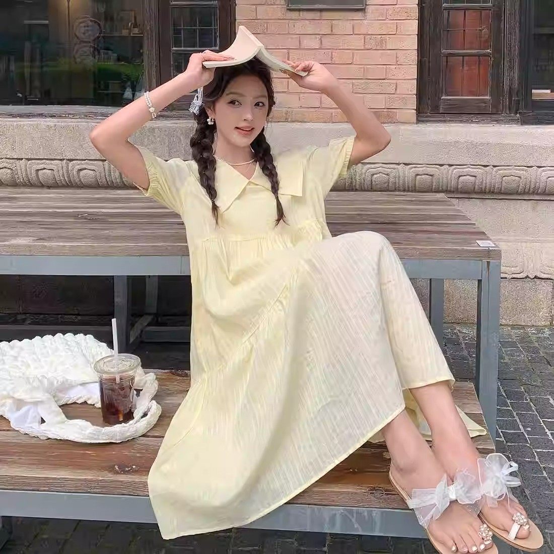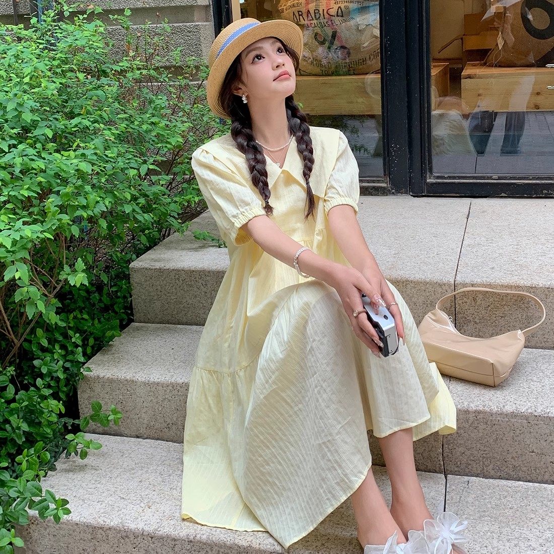 甜美温柔风复古黄色连衣裙女娃娃领小清新茶歇法式气质初恋系长裙