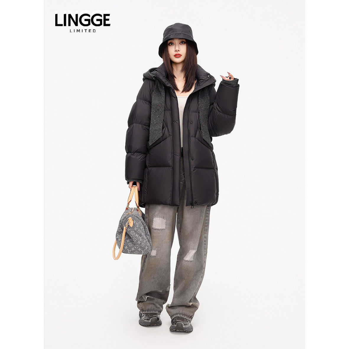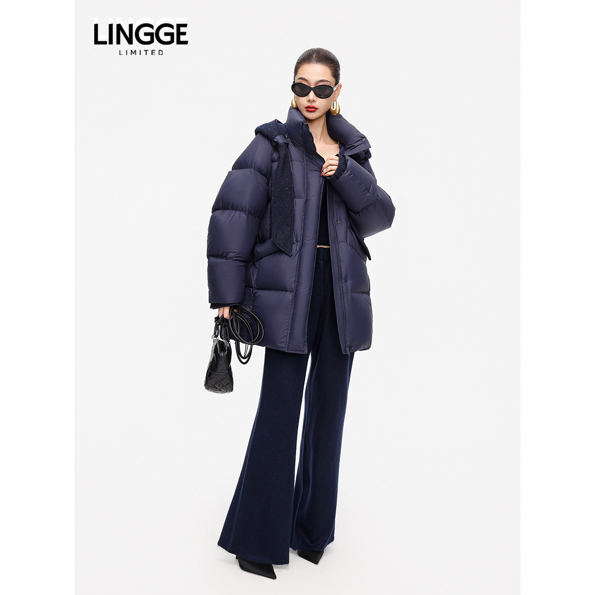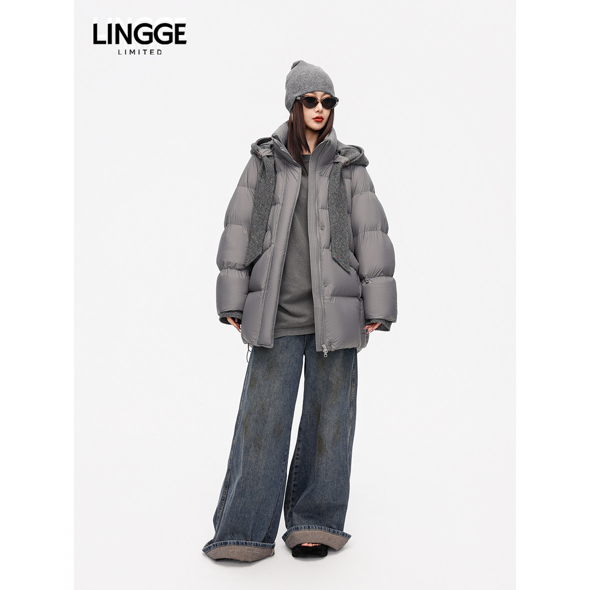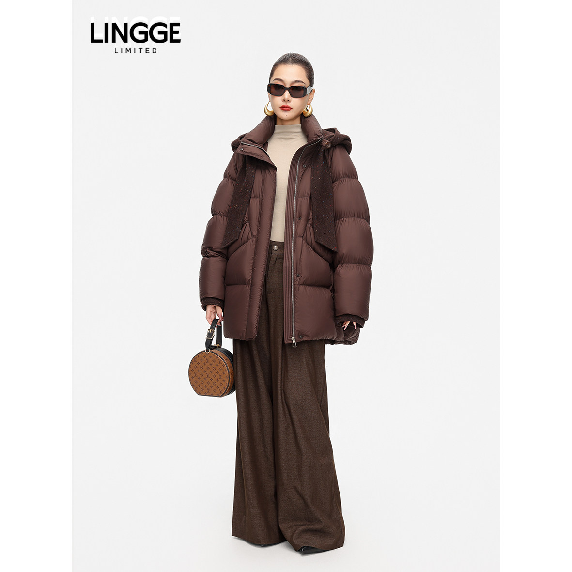 LINGGE ATELIER • 绒意 可拆卸呢料帽中长款白鸭绒羽绒服女