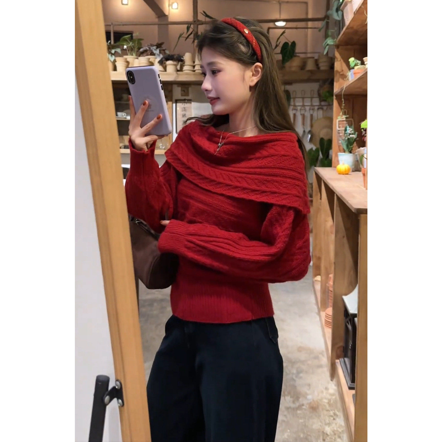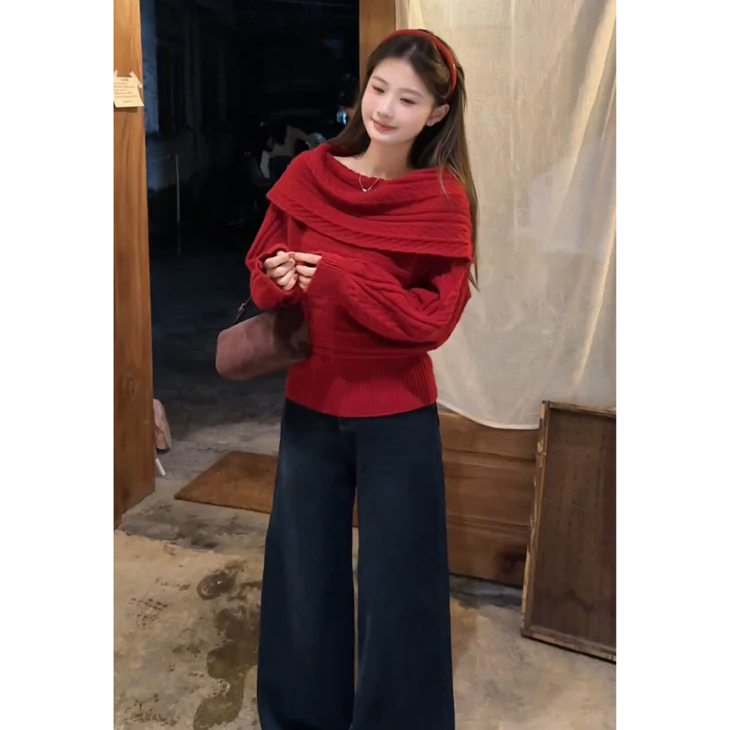 圣诞节穿搭红色一字肩套头麻花毛衣女秋冬季慵懒风露肩针织衫上衣