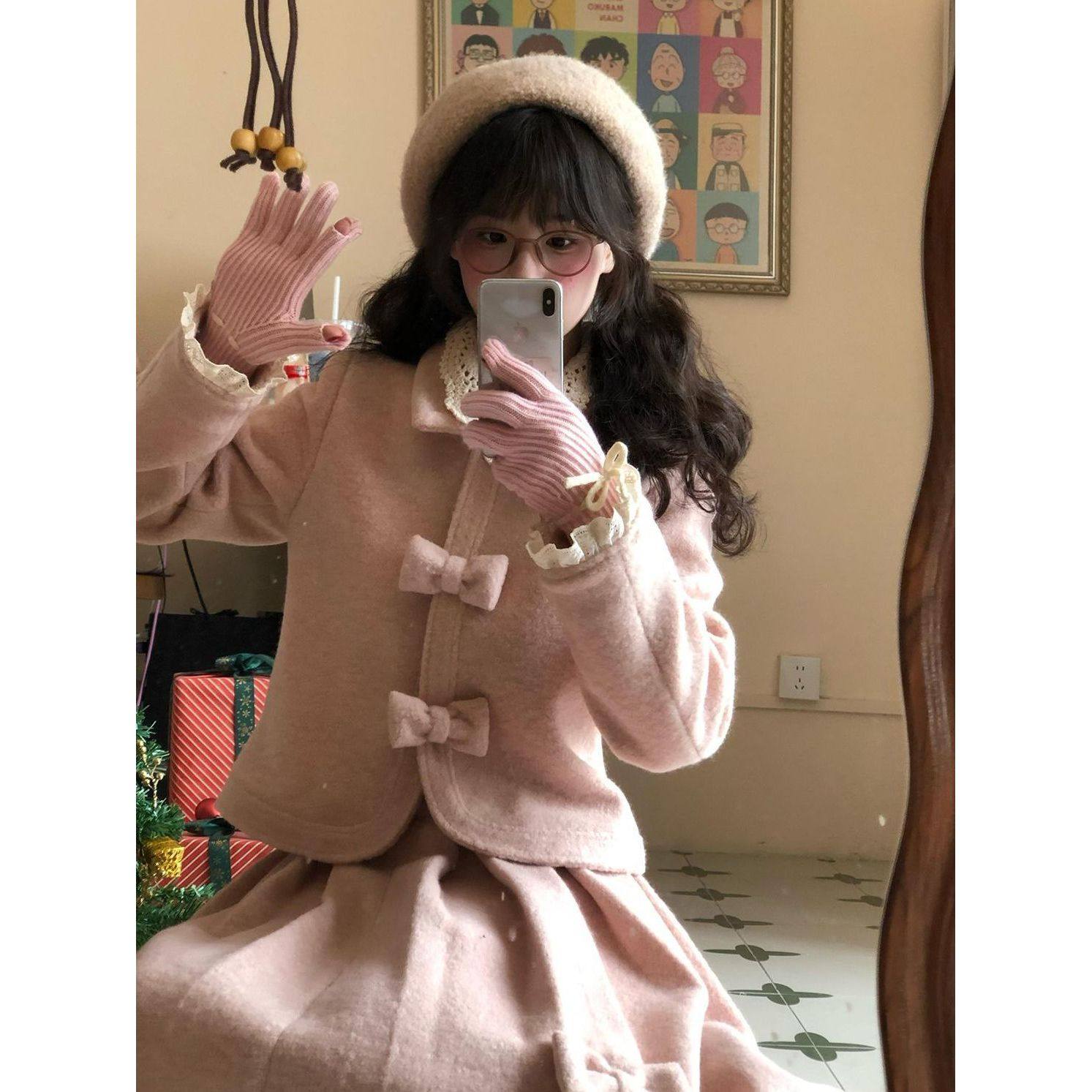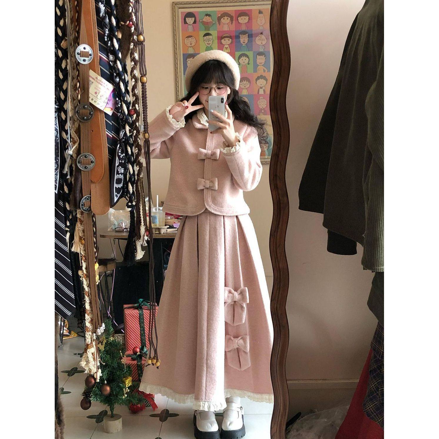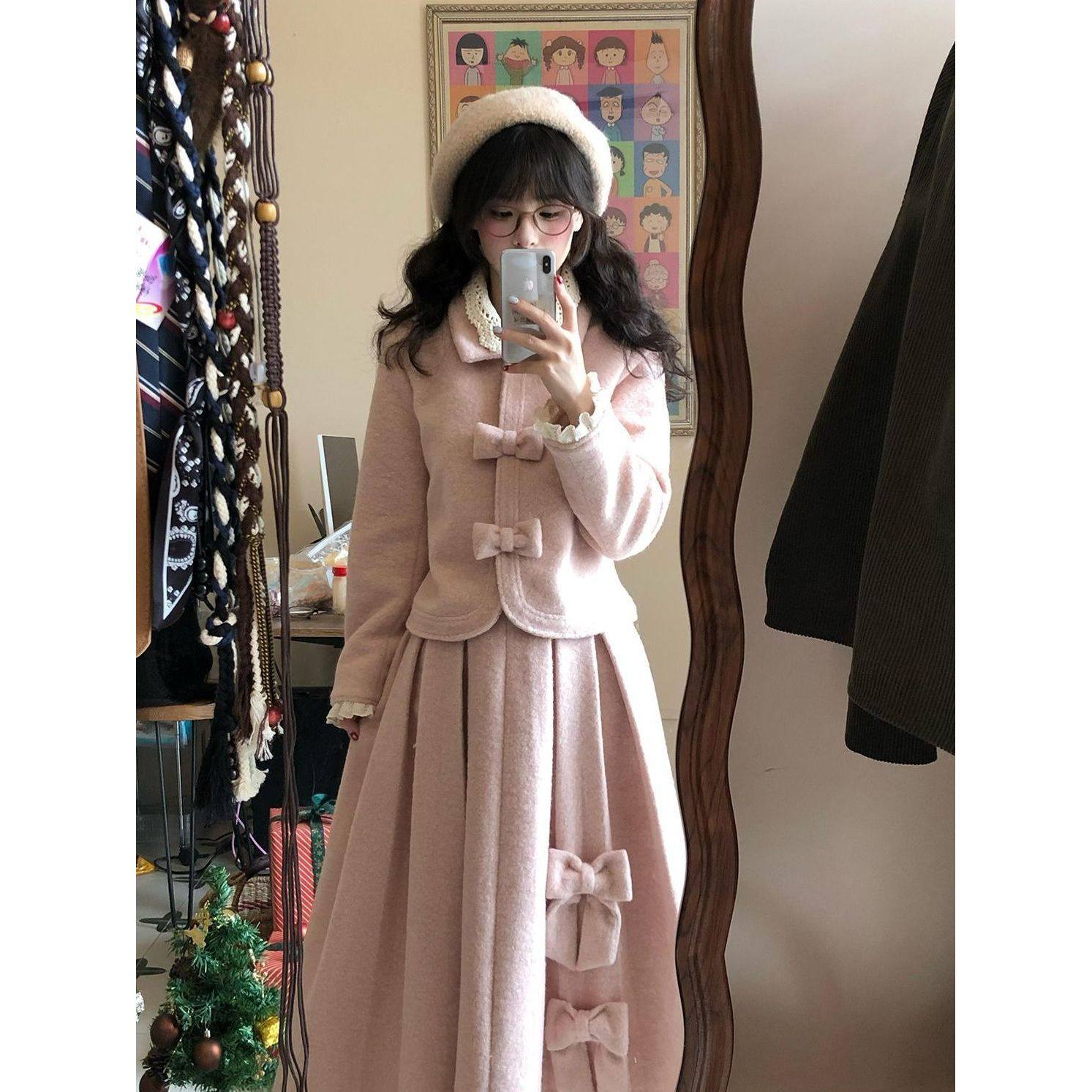 初樱物语 粉色甜美蝴蝶结毛呢上衣+百褶木耳边半身裙两件套装冬