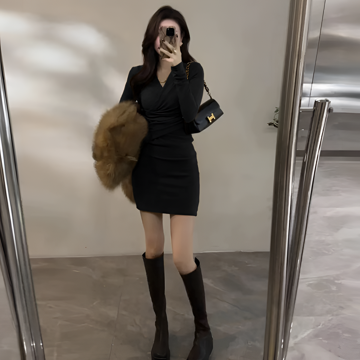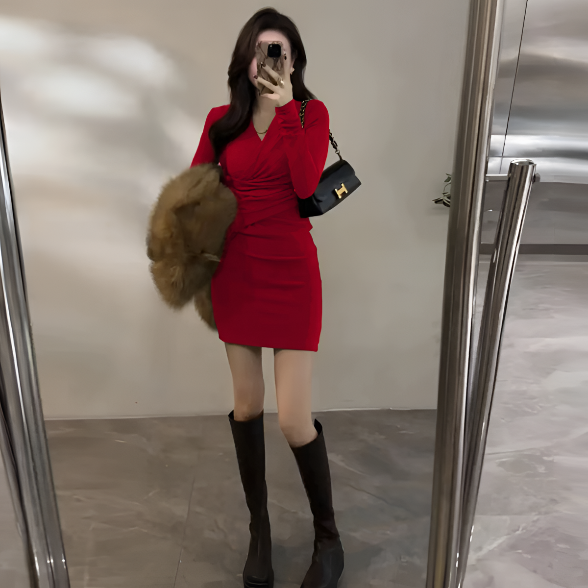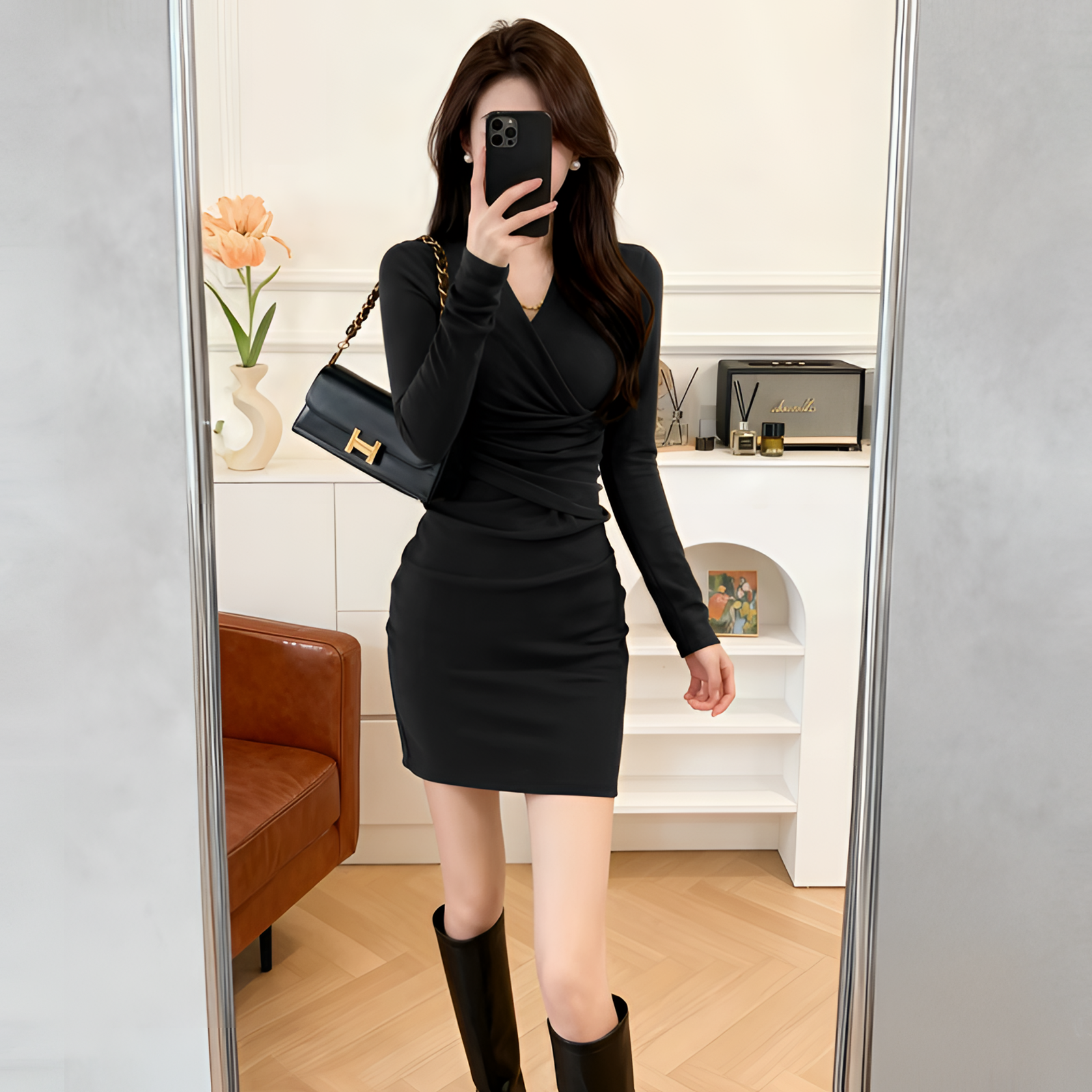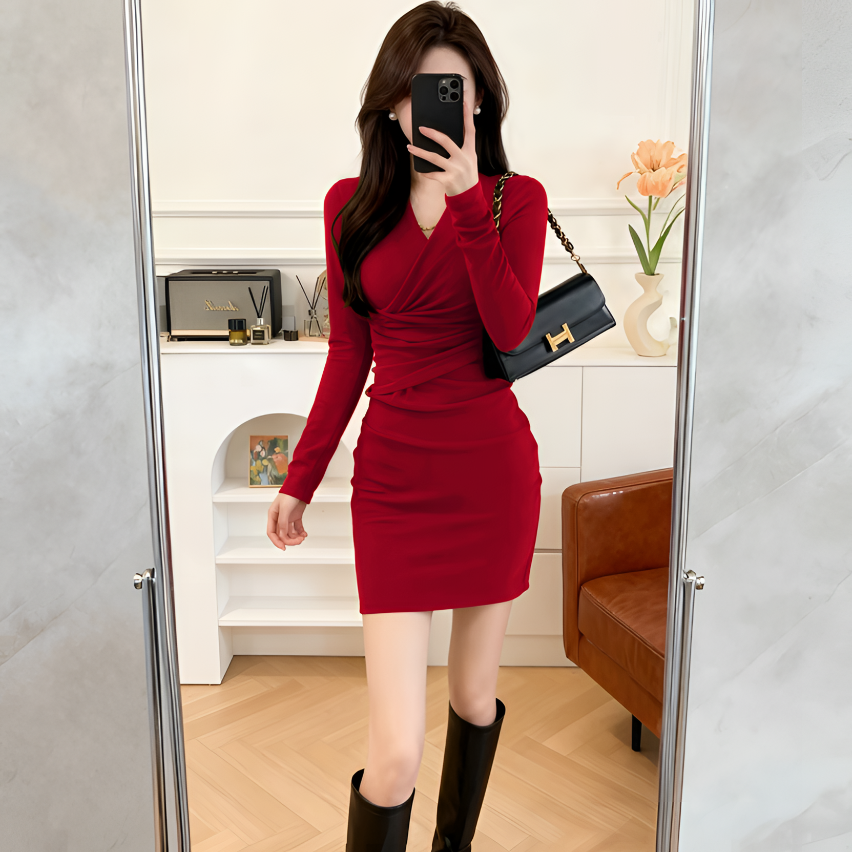 法式V领性感连衣裙女春秋新款收腰修身显瘦气质打底紧身包臀裙子