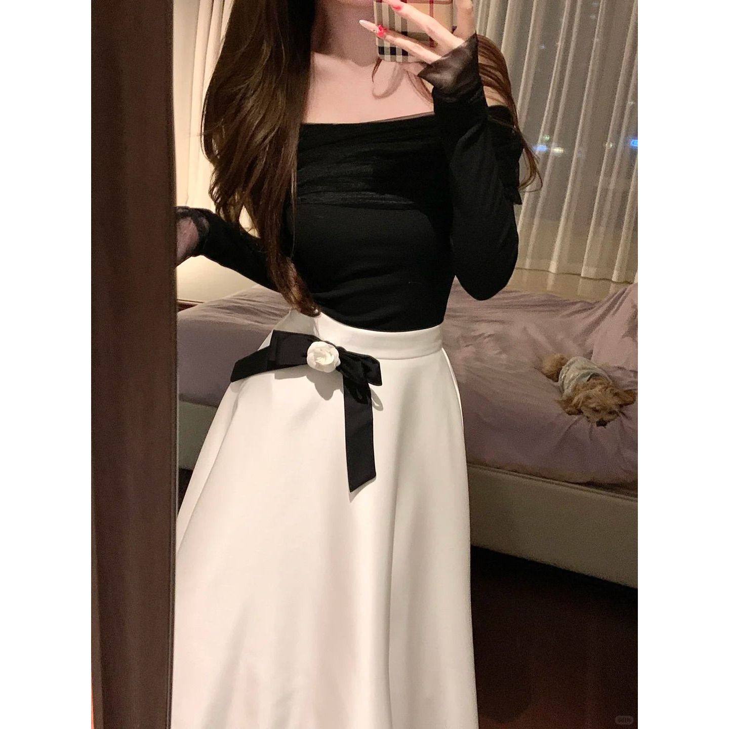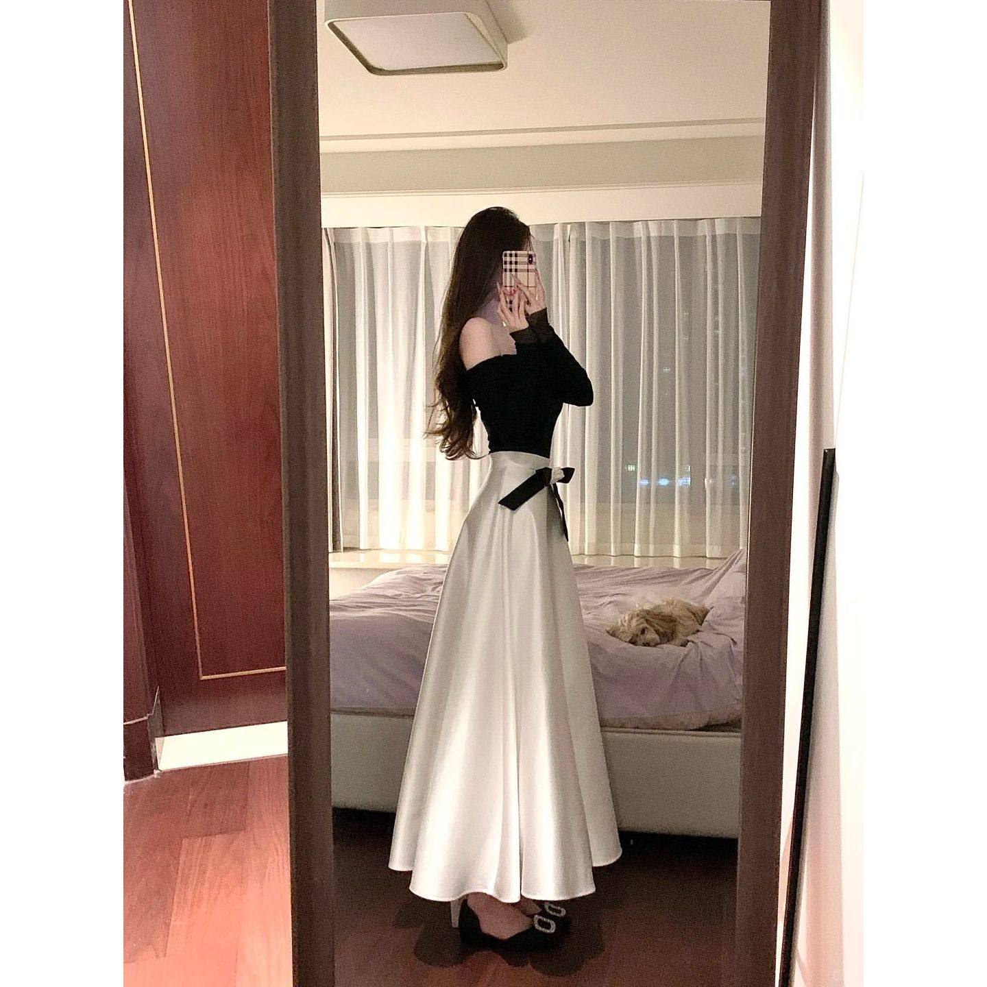 奢雅典范法式高级感网纱褶皱一字肩针织上衣大摆半身裙套