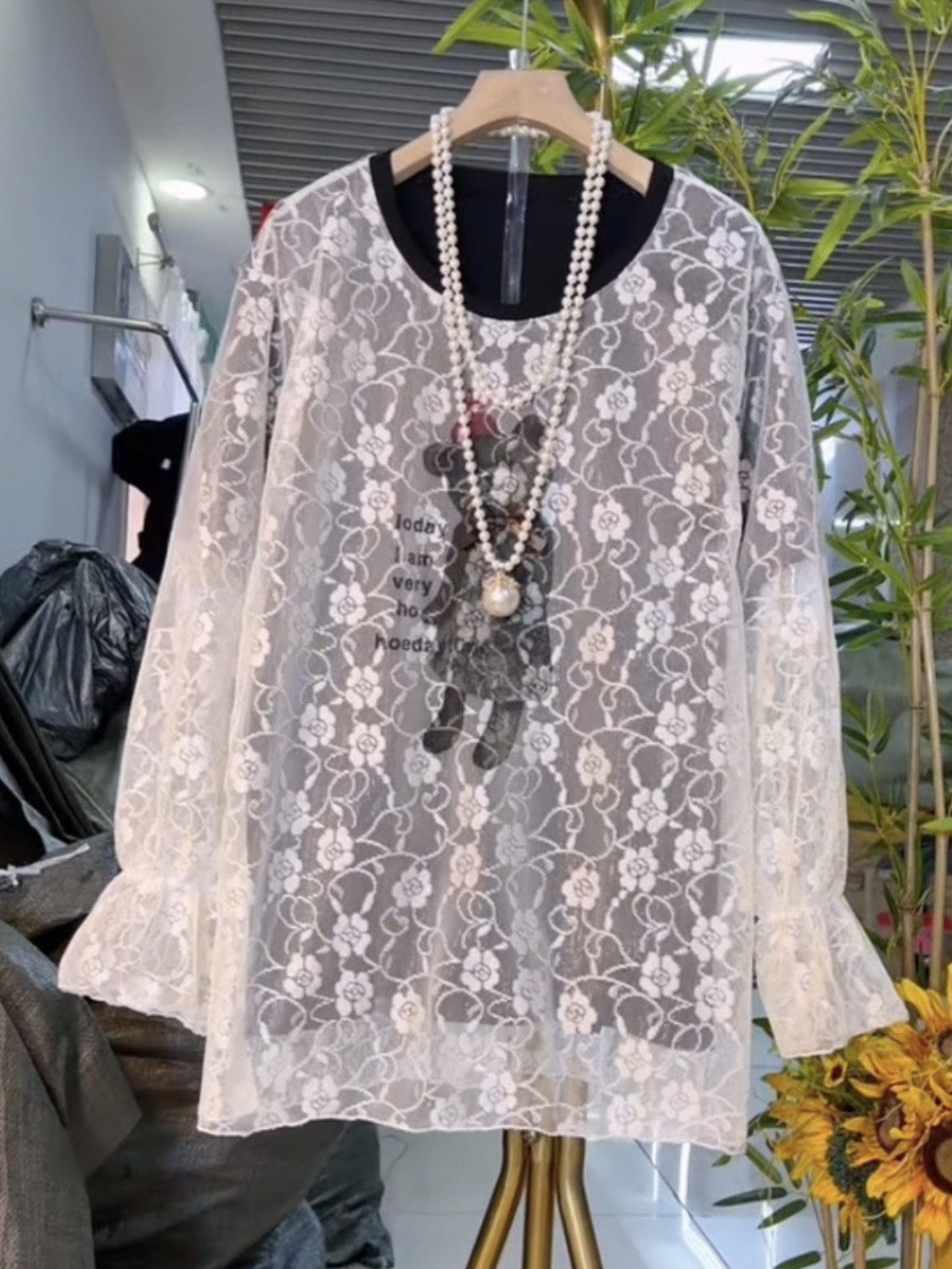 秋冬大码女装蕾丝T恤假两件长袖打底衫内搭上衣减龄小众宽松显瘦