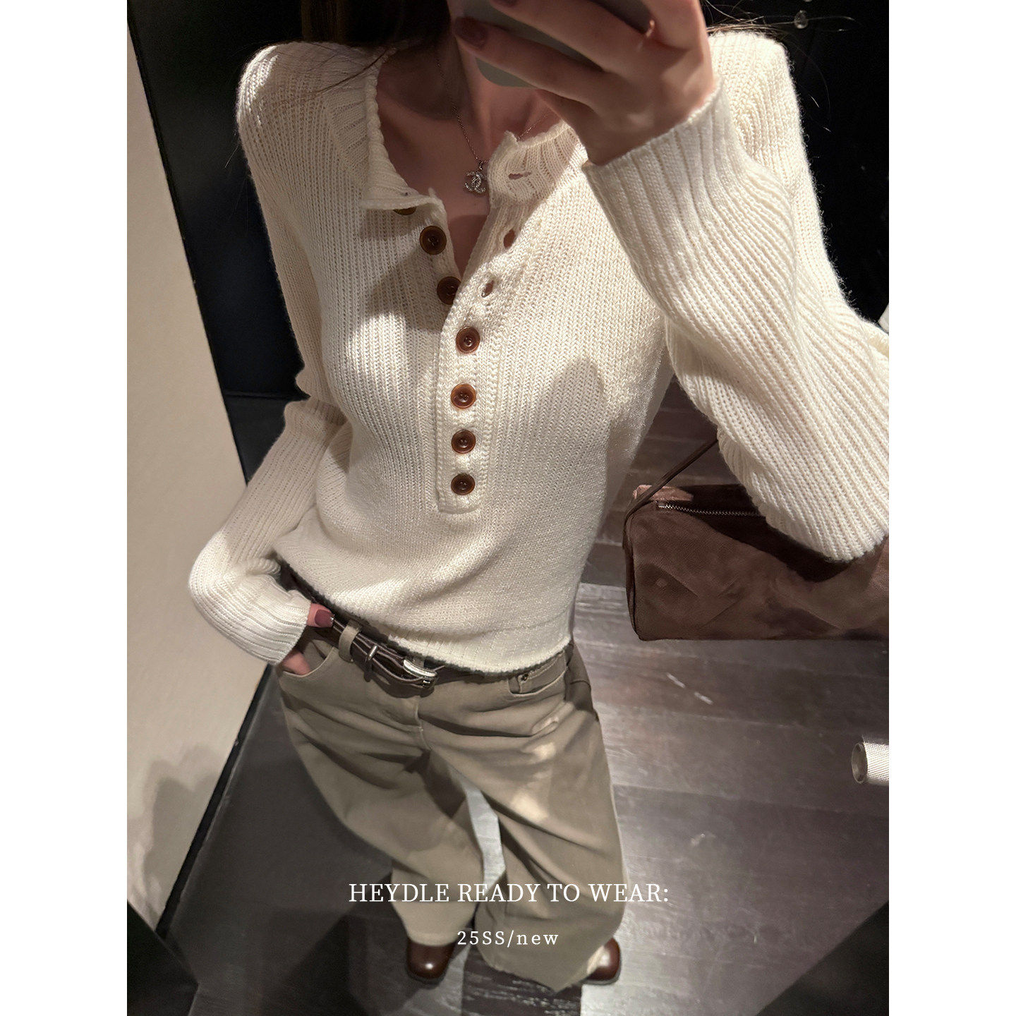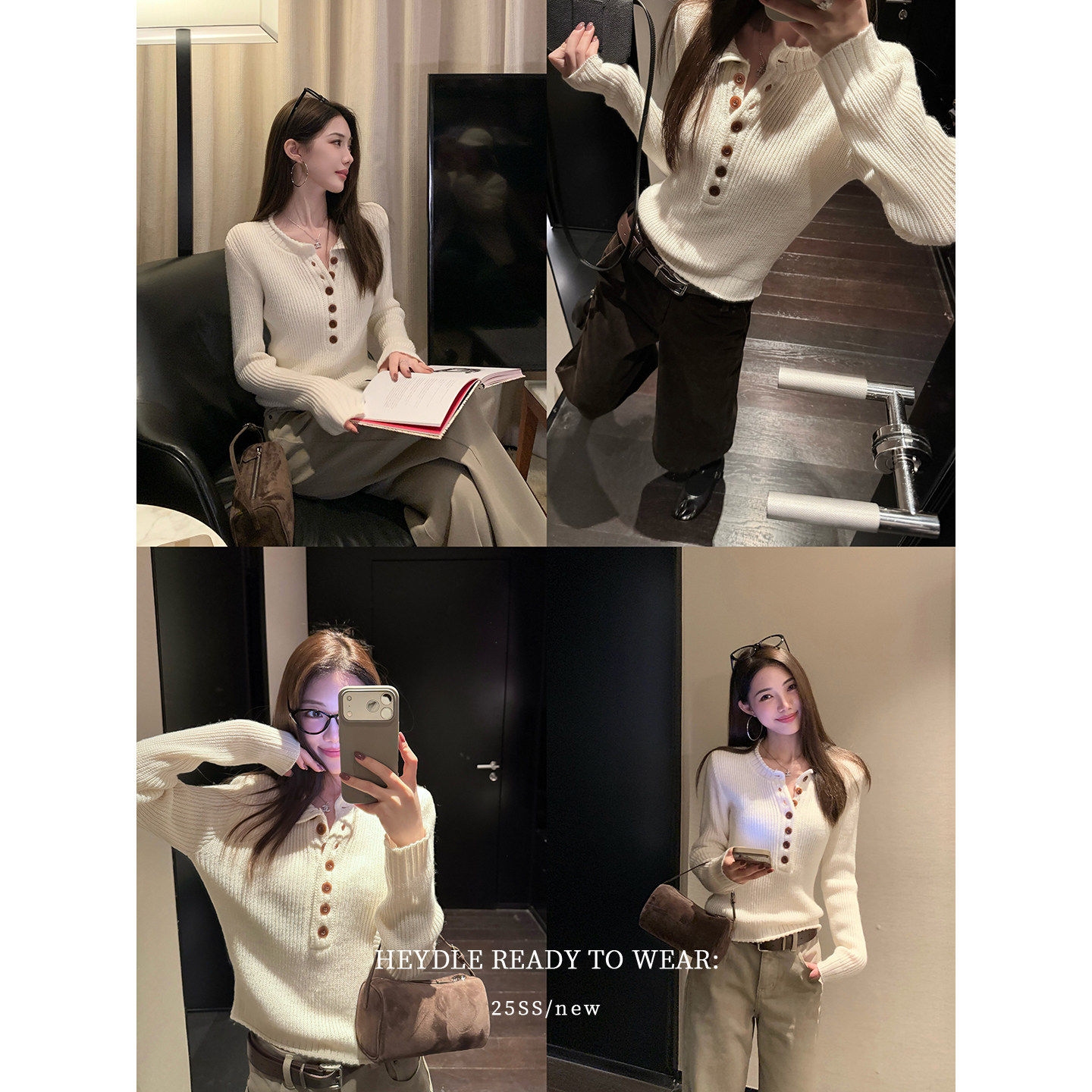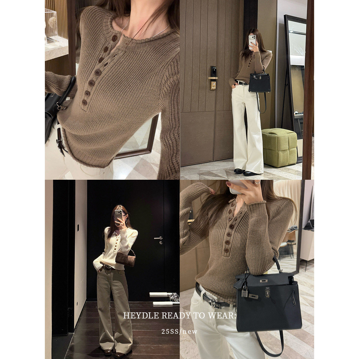 黑豆哼哼 缪缪女孩*绵羊毛混纺复古粗针毛衣亨利领系扣内搭针织衫
