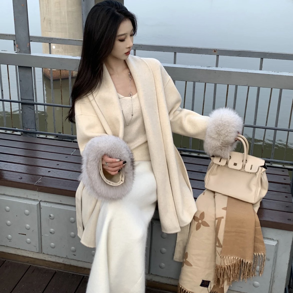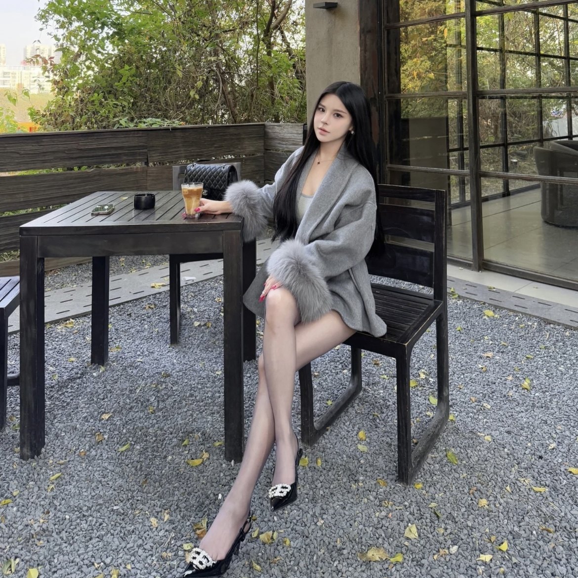 羚羊绒毛呢长袖外套女秋冬高级感收腰绑带毛毛拼接呢子开衫上衣