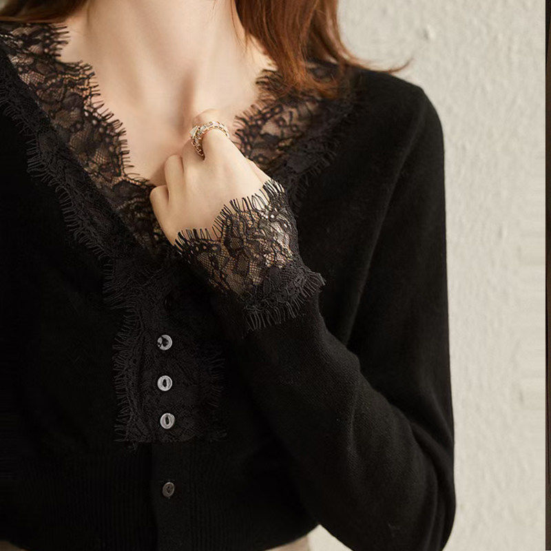 白色蕾丝打底衫女秋冬高级感洋派内搭小个子V领针织衫上衣毛衣
