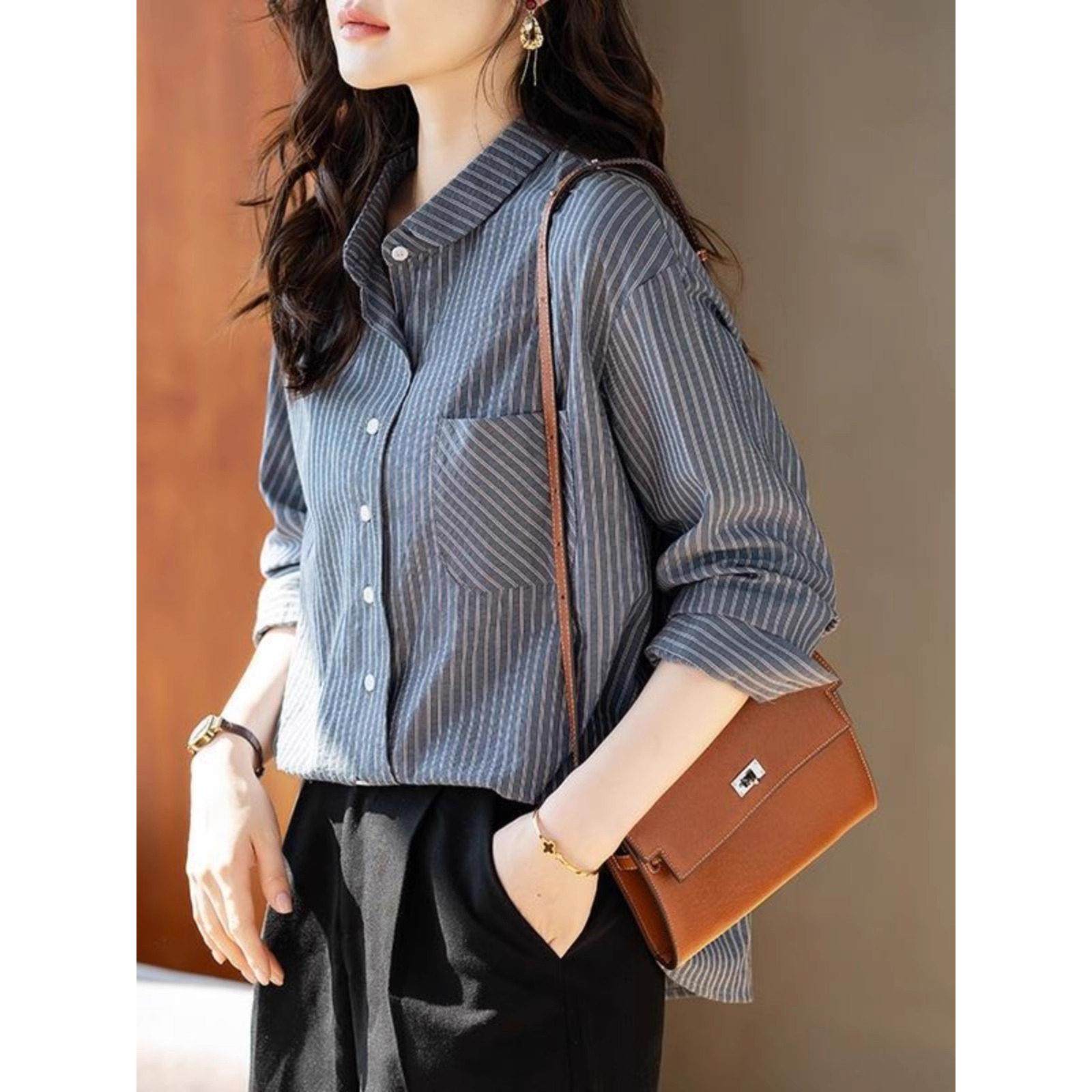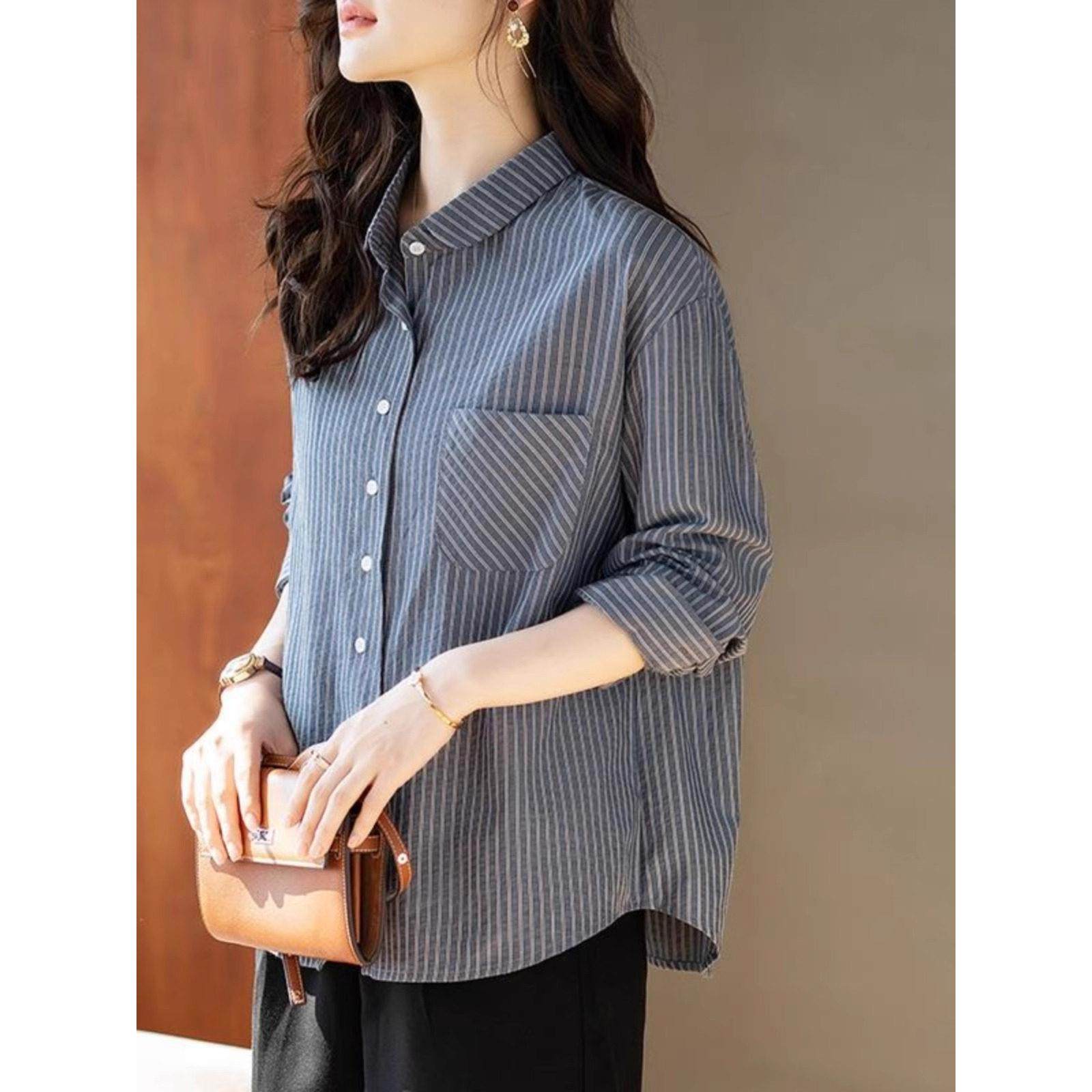 气质上衣港风覆古条纹长袖衬衫女士秋装新款宽松休闲叠穿衬衣百搭