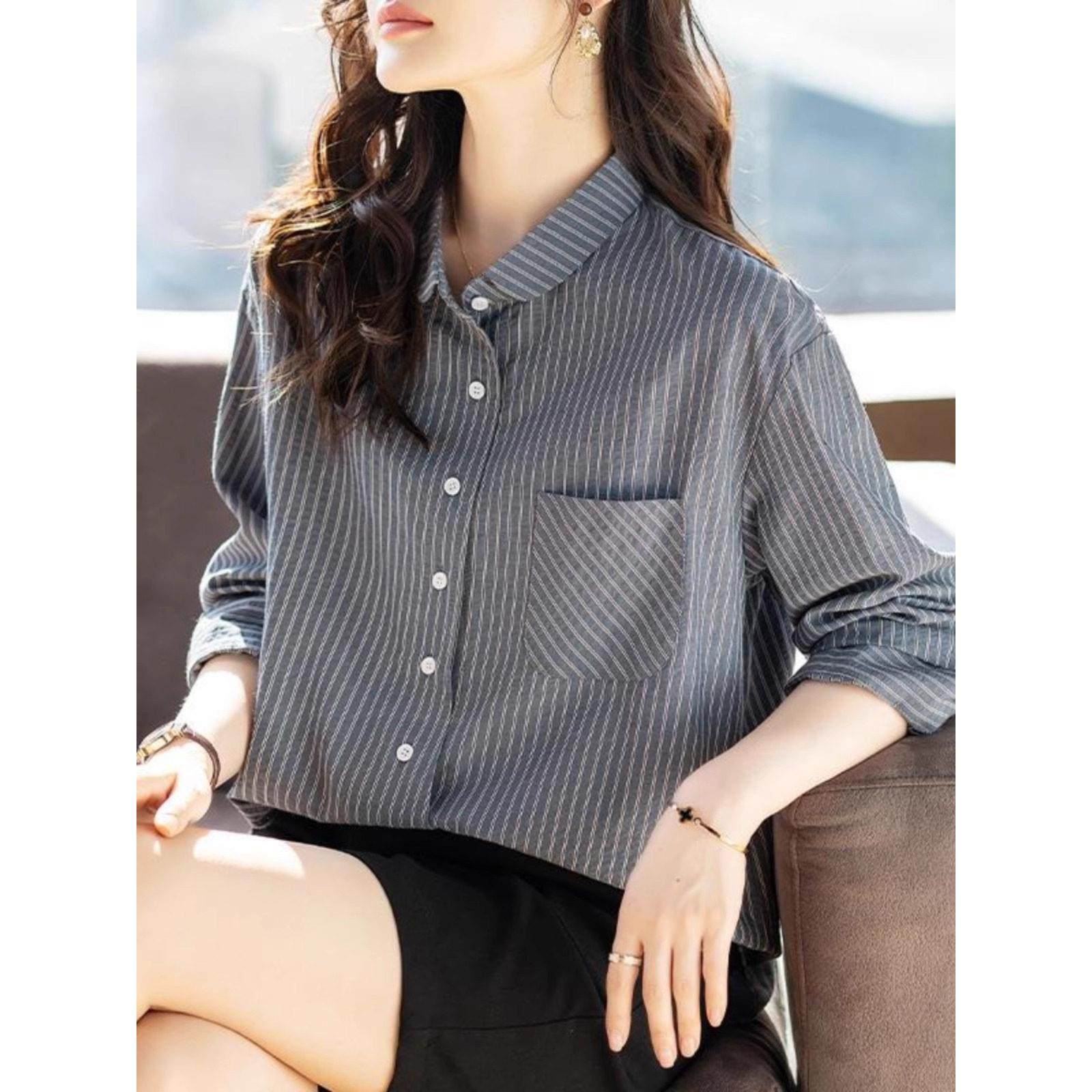 首页> 女装> 气质上衣港风覆古条纹长袖衬衫女士秋装新款宽松休闲叠穿衬衣百搭