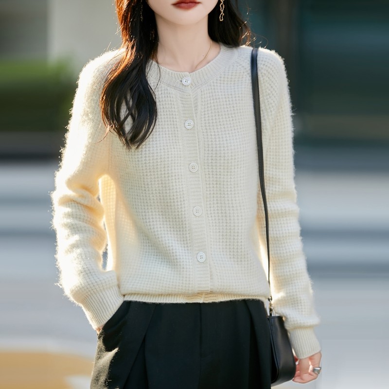 鄂尔多斯市100%纯山羊绒衫女圆领加厚宽松慵懒风针织开衫毛衣外套