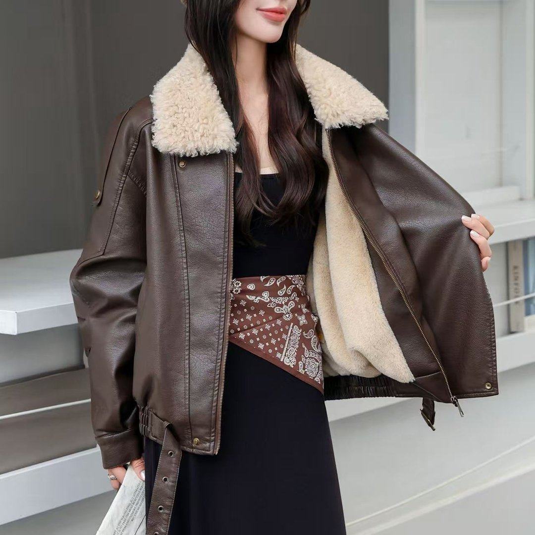 实拍实价酷飒羊羔绒毛领蛋白皮衣外套女加厚加绒美式机车宽松夹克