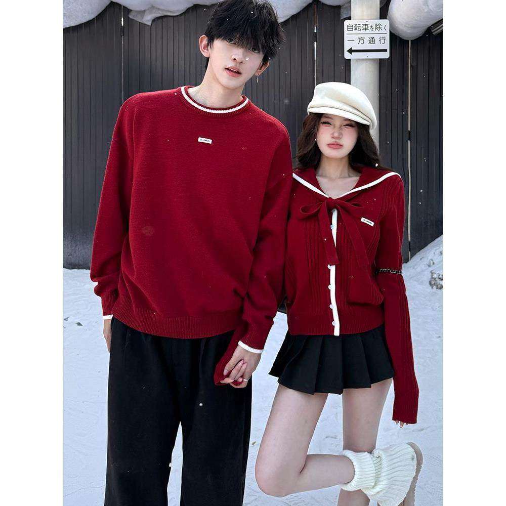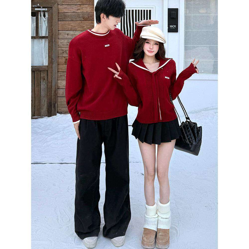 海军领情侣装学院风红色毛衣女秋冬季2025韩系新年圣诞针织衫上衣