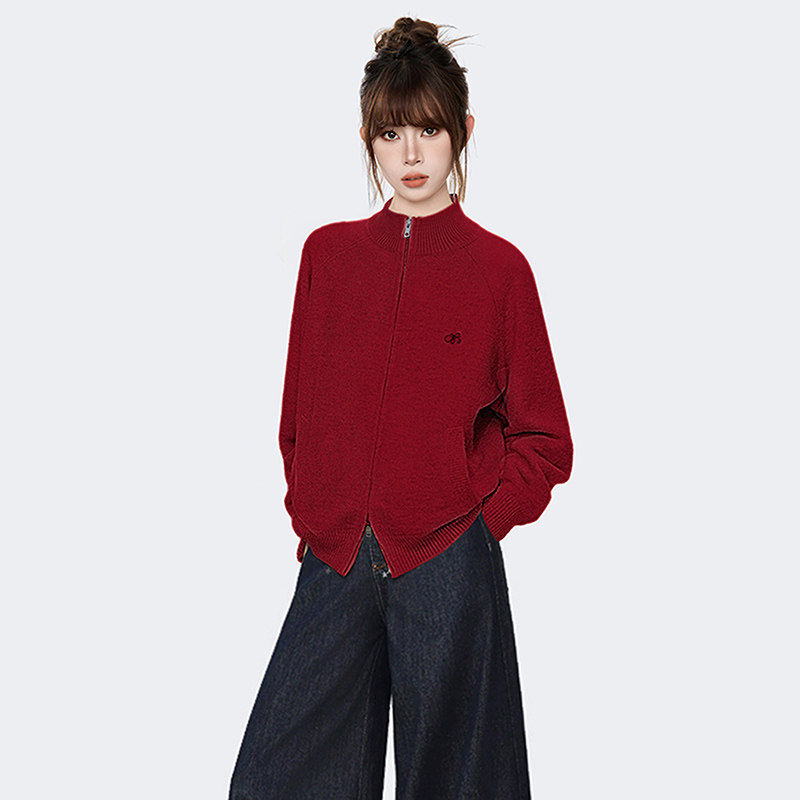 新年红色立领高领毛衣外套女秋冬冬季加厚高级感针织开衫拉链上衣