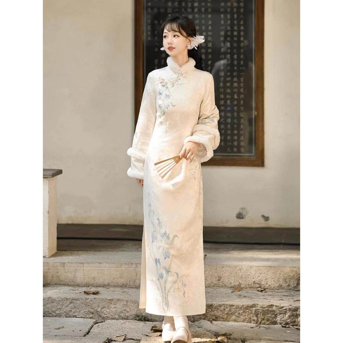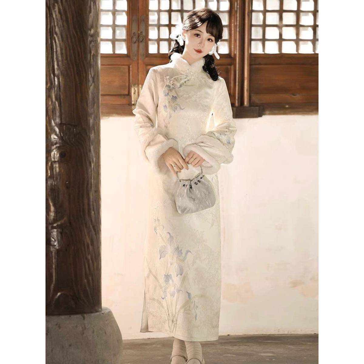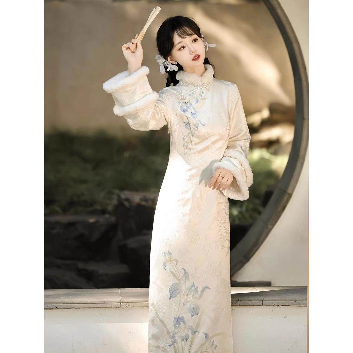 加绒加厚鸢美人民国风复古改良旗袍新款新中式连衣裙日常秋冬