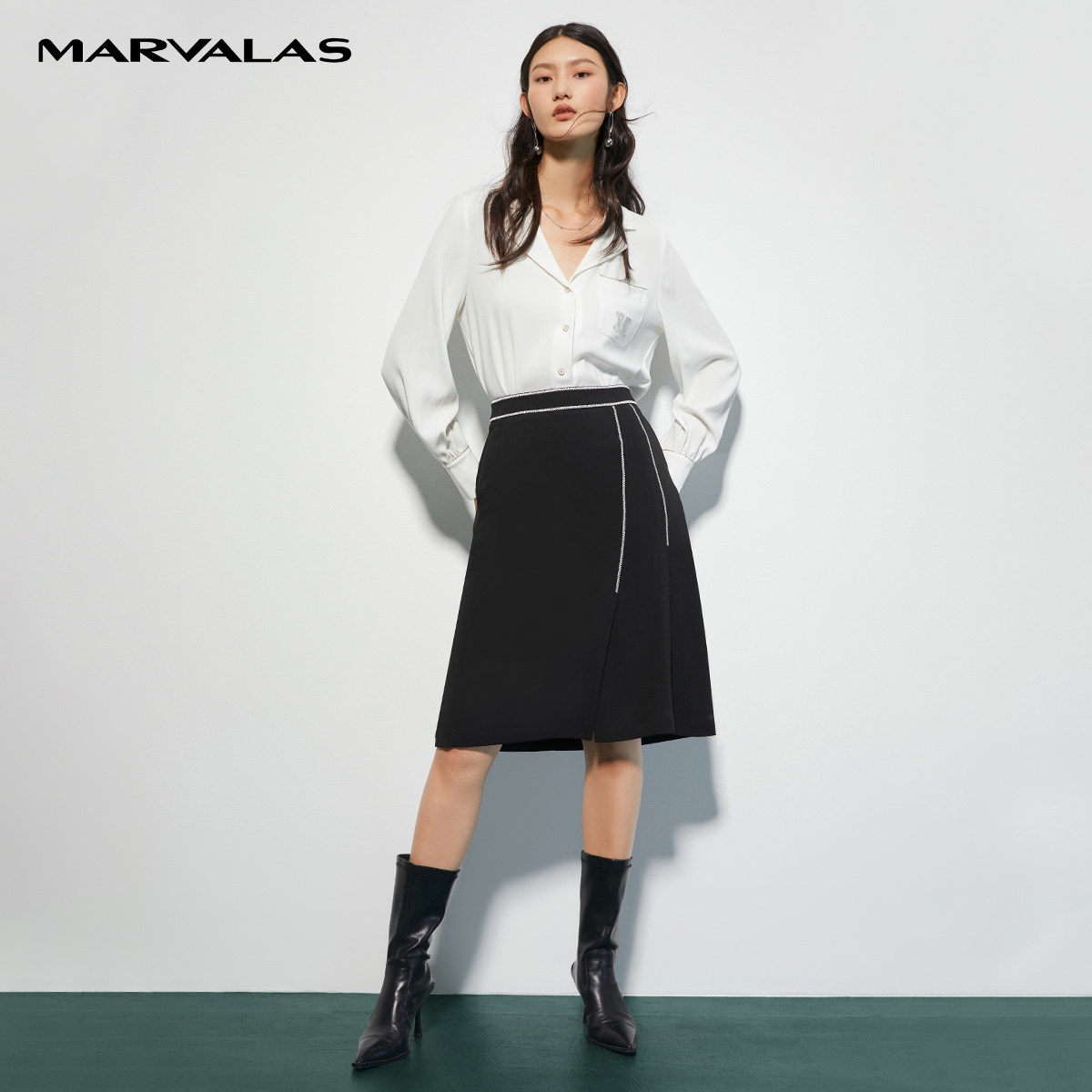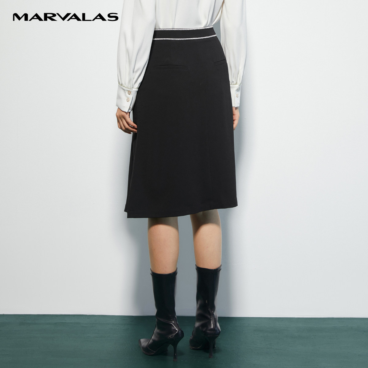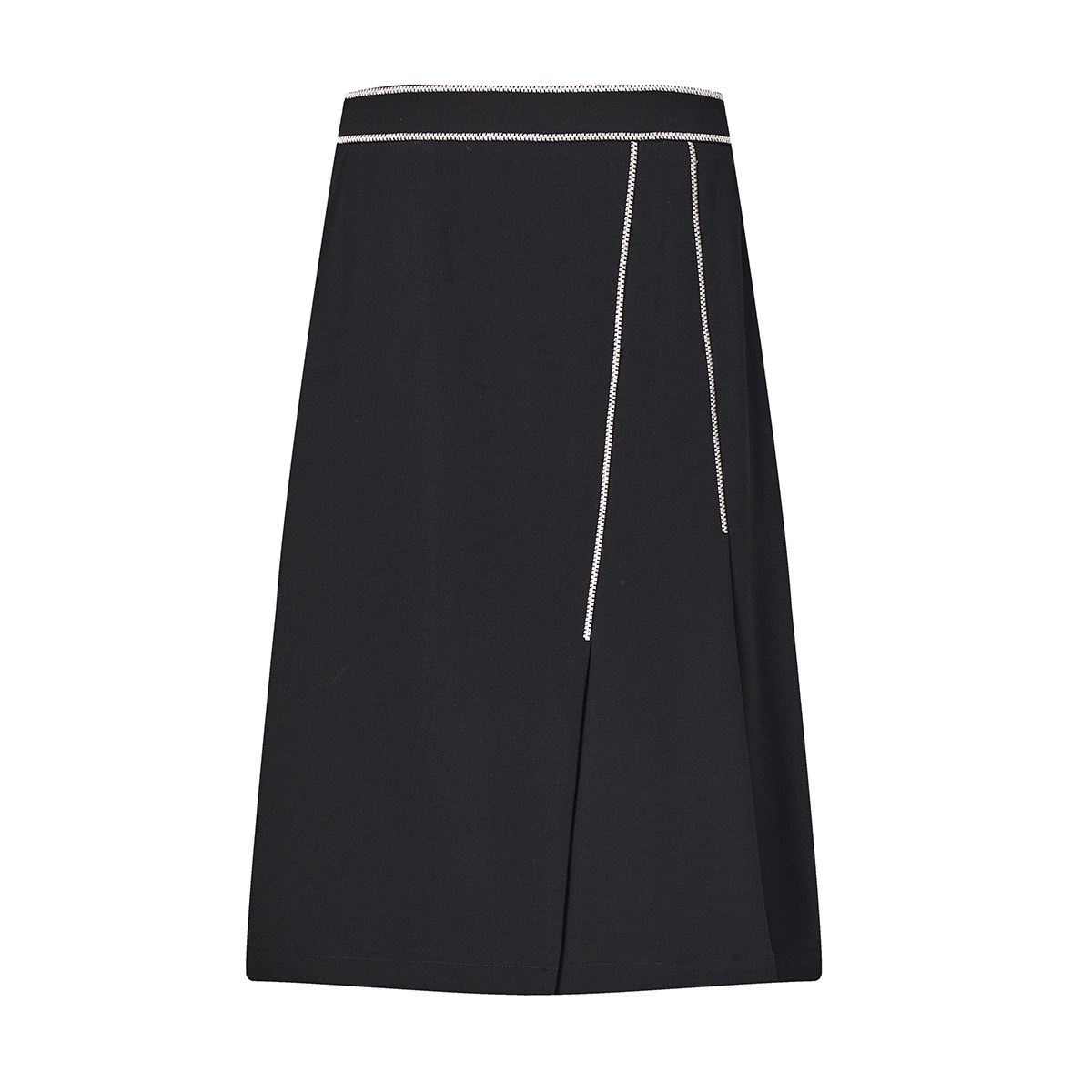 【粉丝专属】曼德诗黑色半身裙女2022夏季腰部撞色OL下M230688